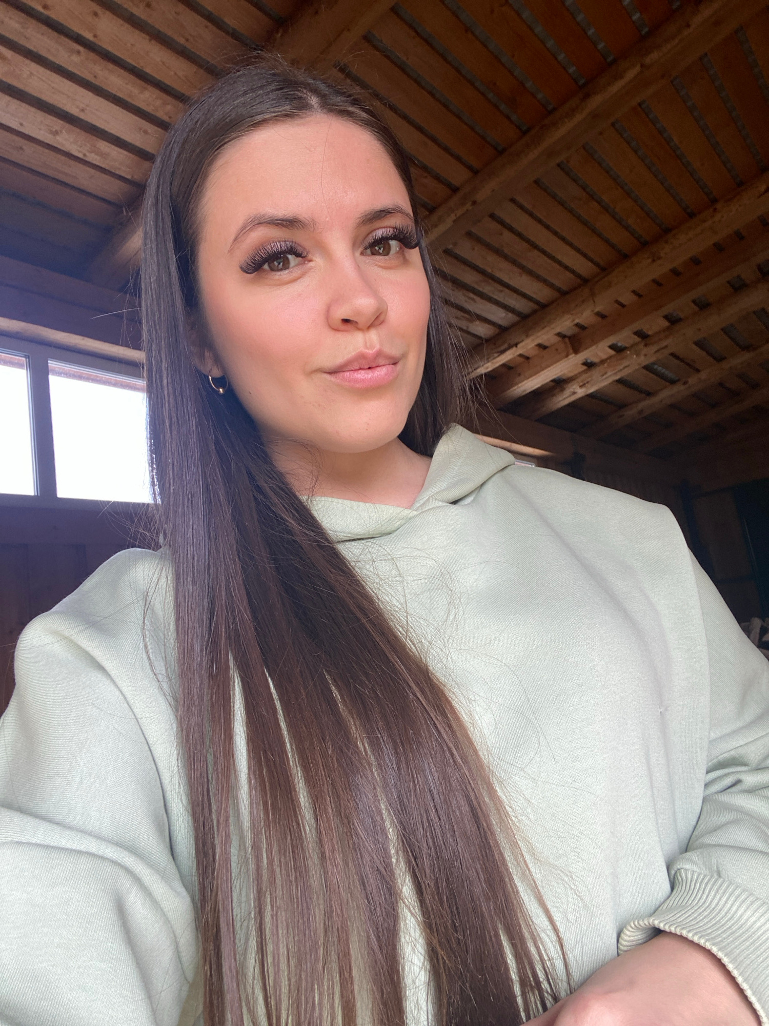 A woman is seen from a low angle, tilted to the right. She has long, straight, dark brown hair and wears a light green hooded sweatshirt. Her makeup includes enhanced eyelashes. The background feature…read more
