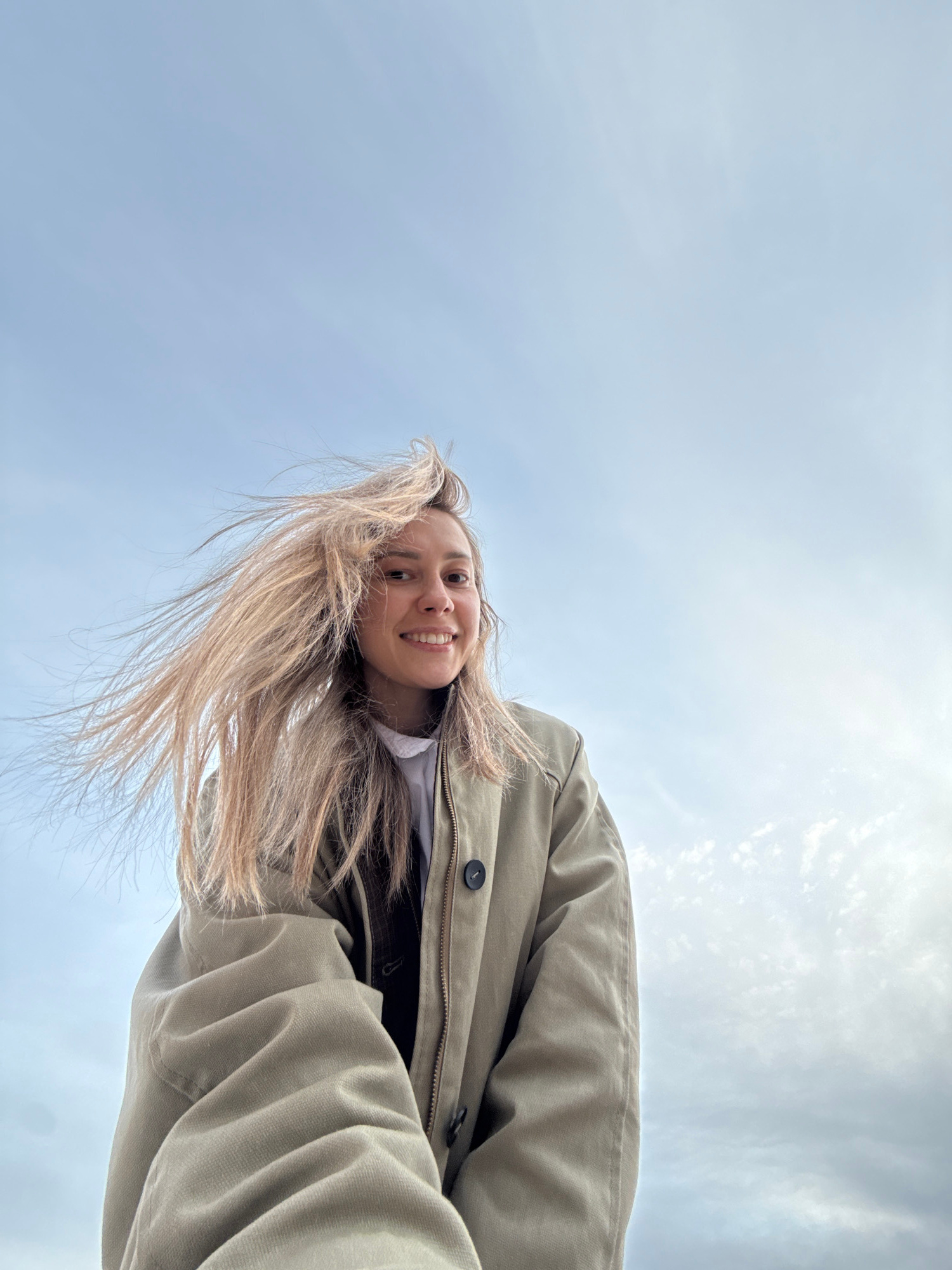 A woman with long, blonde hair smiles at the camera from a low angle. She is wearing a beige jacket and a white shirt. The background is a cloudy sky. The location is Chaikovsky, Russia.