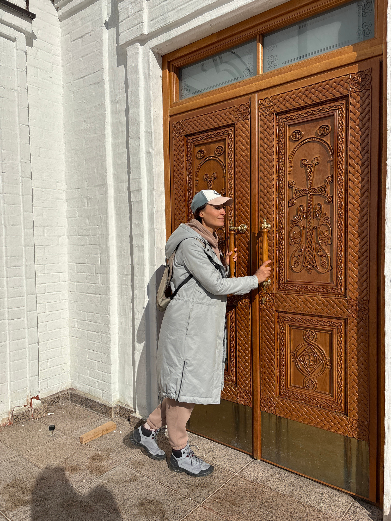 A woman in a gray coat, peach-colored pants, and gray sneakers is pulling on the wooden handles of a large, ornately carved wooden door. The door has two panels with cross-like patterns. The setting a…read more