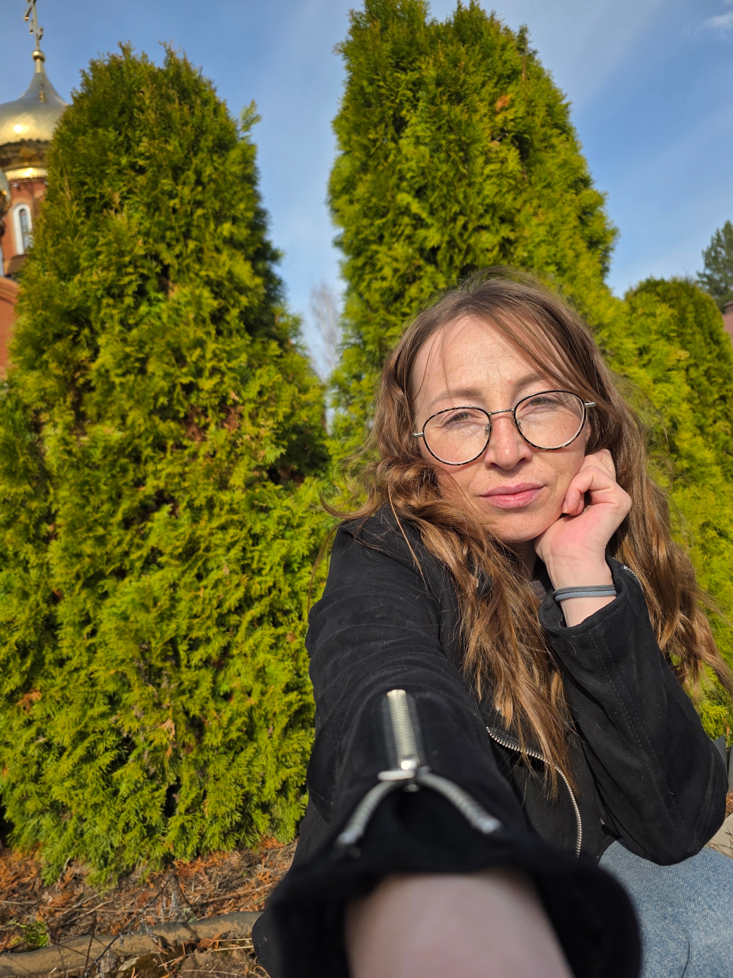 A selfie-style photograph shows a person with light skin, brown hair, and freckles, wearing round glasses. They are reclining and holding their hand near their face. The person is wearing a black jack…read more