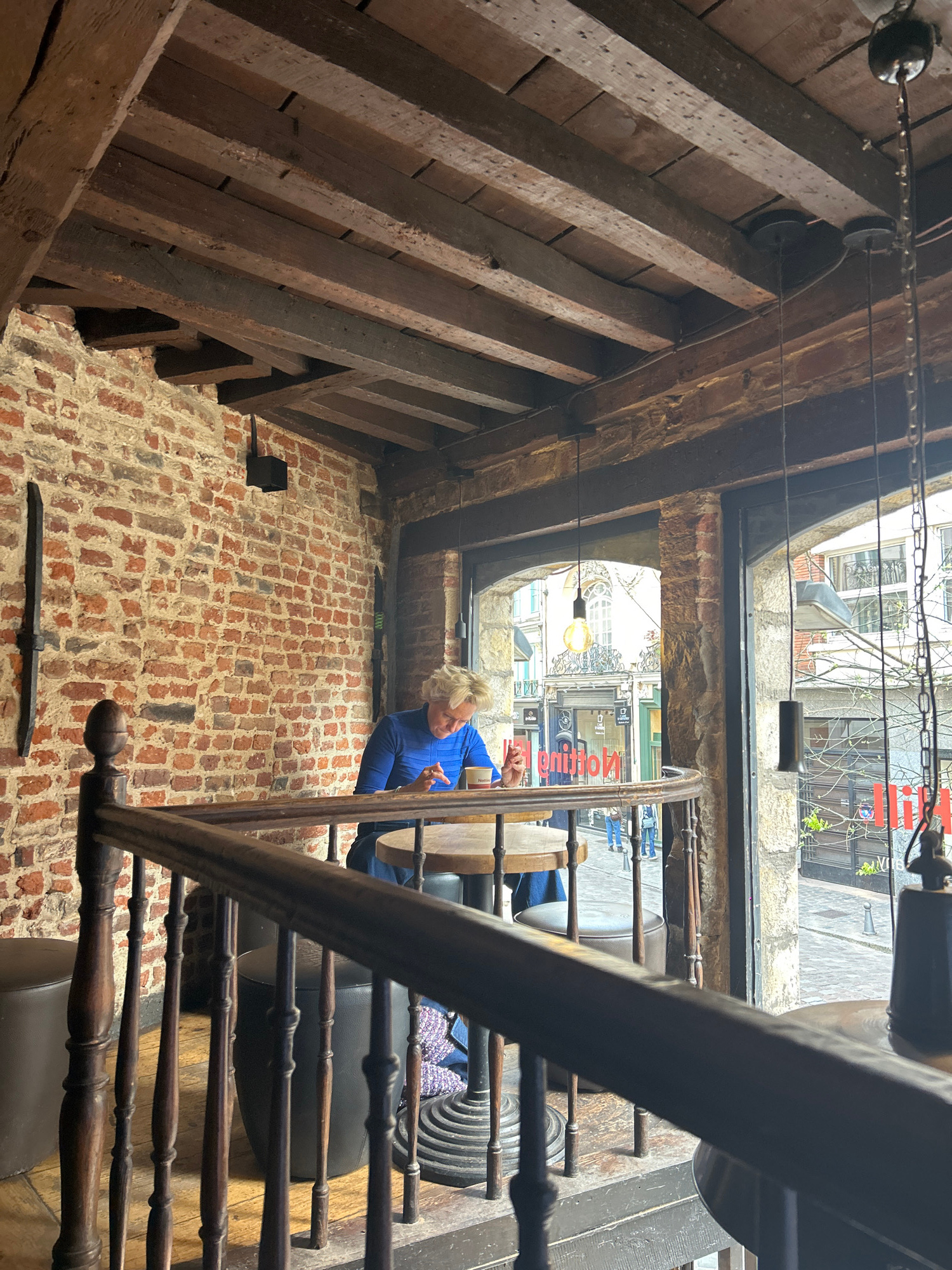 An interior view looking up through an open hatchway, likely in Lille, France. The composition features a wooden beam ceiling to the left, exposed brick walling, and parts of machinery including a lar…read more