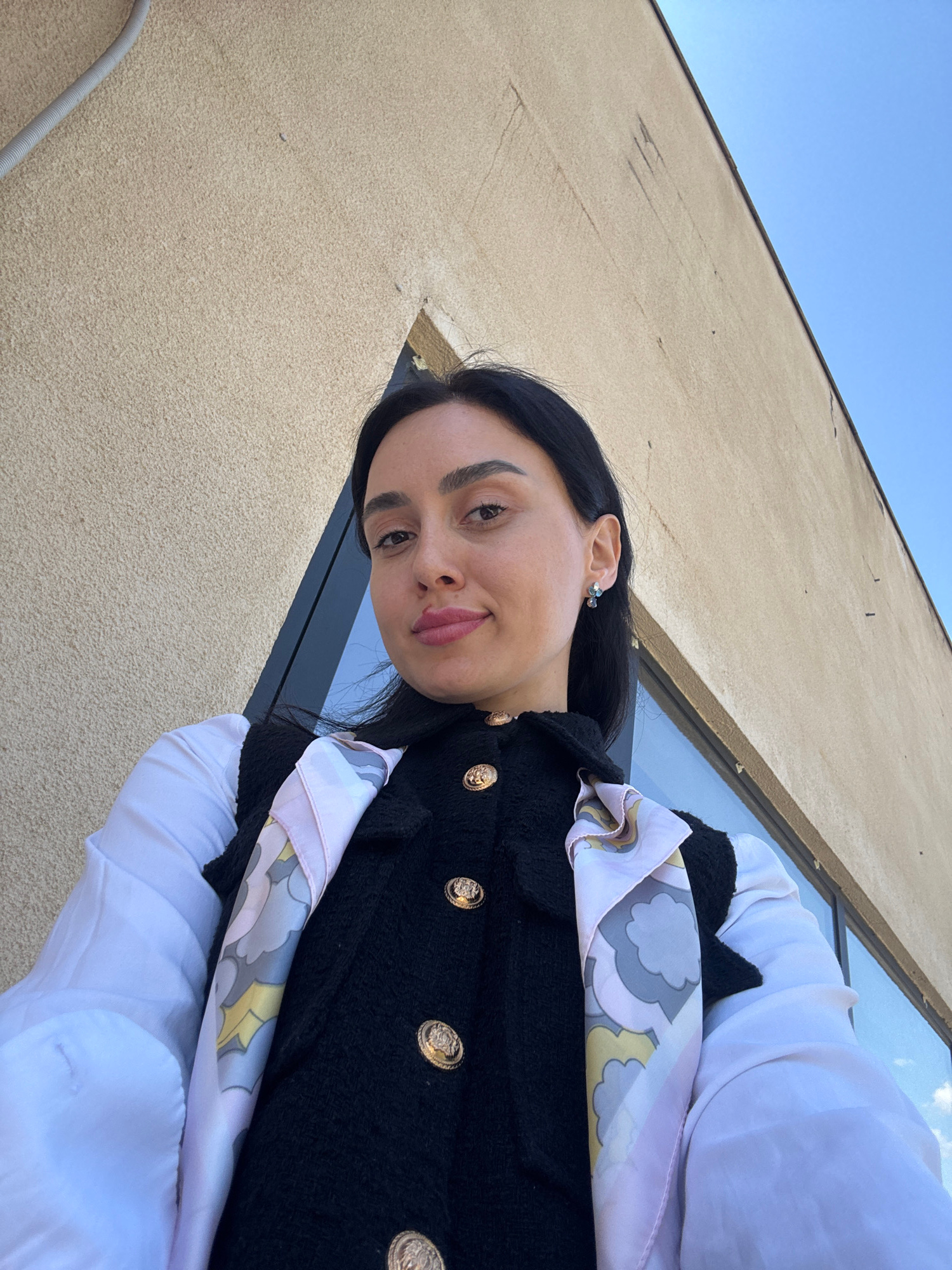 The image, oriented vertically, captures a close-up of a woman outdoors on a bright day in Tbilisi, Georgia. She is positioned in the lower left portion of the frame, looking directly towards the came…read more