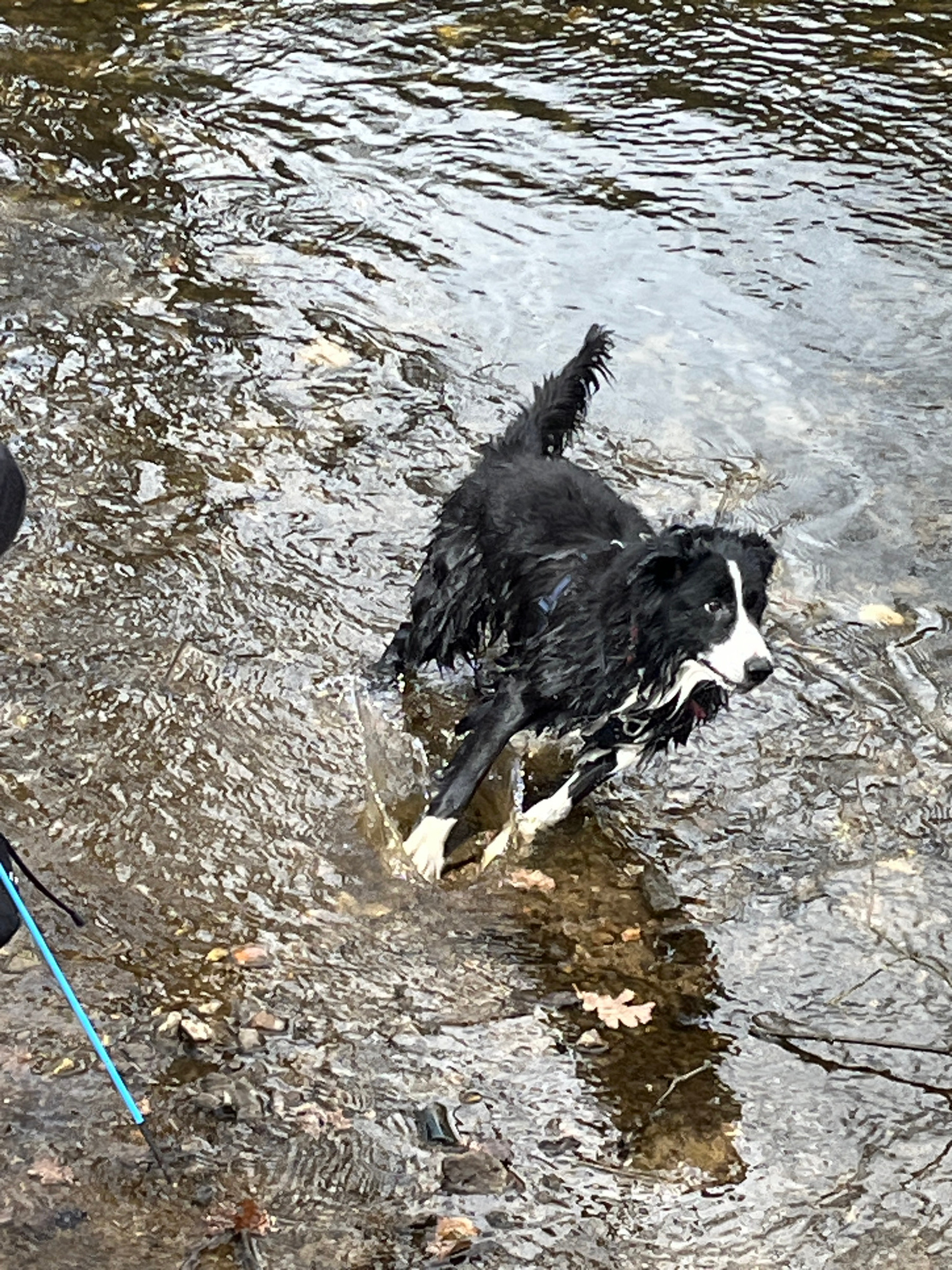 A black and white dog is lying in shallow, flowing water, possibly a stream or creek. The water appears clear, allowing the streambed to be visible. The stream is surrounded by trees and foliage. Sain…read more