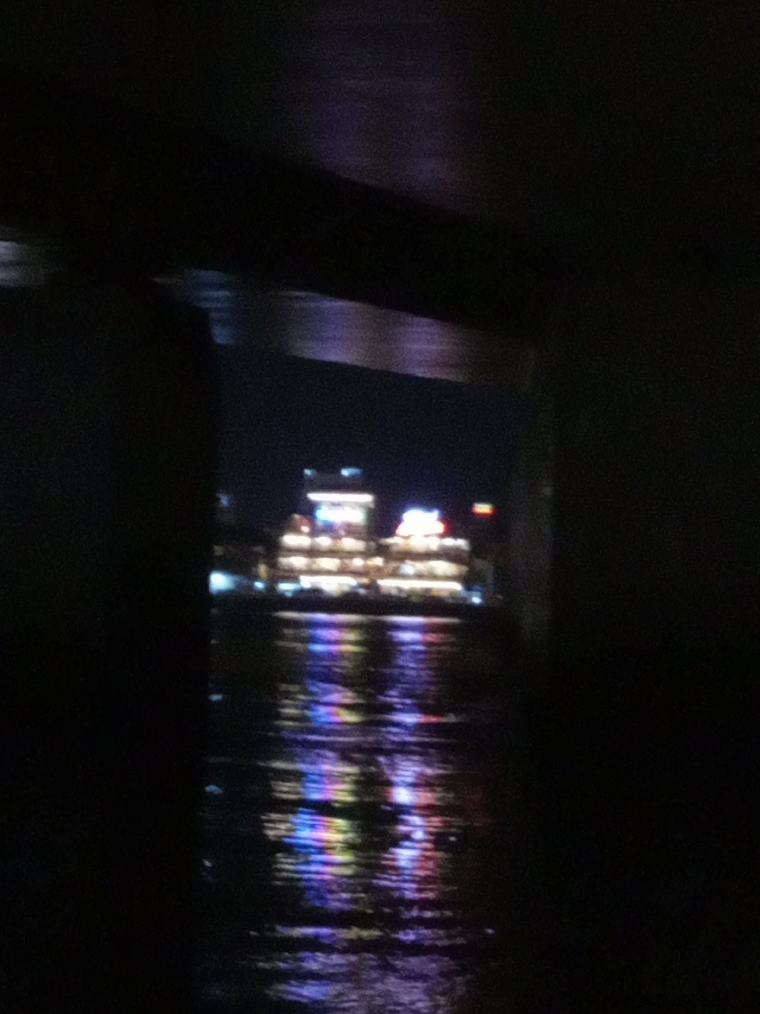 The image shows a blurred, nighttime view of a lit building across a body of water. The view is framed by dark, indistinct structures, possibly a bridge or building, creating a tunnel-like perspective…read more