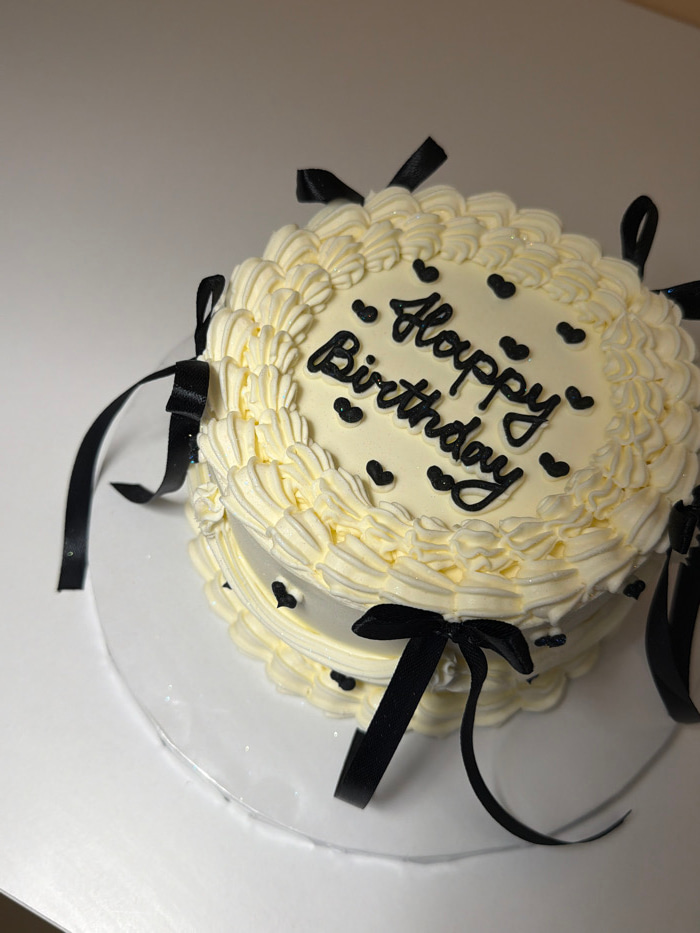 A two-tiered round cake, decorated with creamy white frosting and adorned with black ribbon bows, sits on a clear plastic cake stand. The top tier features "Happy Birthday" in black script, punctuated…read more