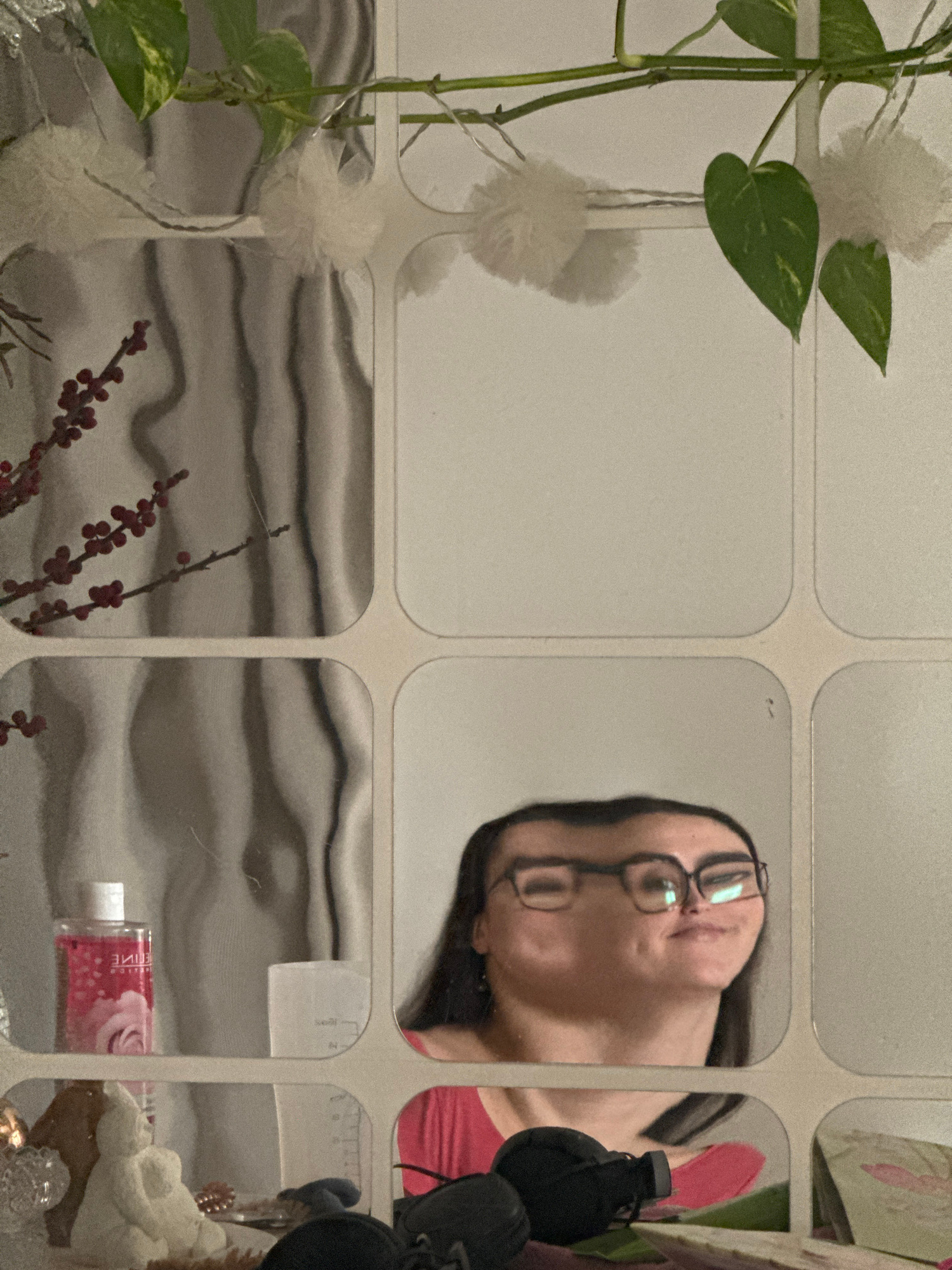 The image shows a collection of small square mirrors arranged in a grid pattern. Reflected in the mirrors are several objects and a person. In the top right mirror, a person with dark hair and glasse…read more