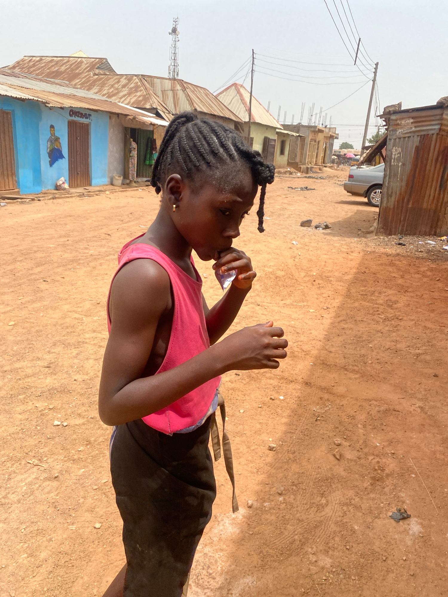 An outdoor scene in Rido, Nigeria, depicts a young individual standing on a dry, light brown dirt road under a hazy sky. The subject, appearing female, has dark skin, braided hair, and wears a pink sl…read more