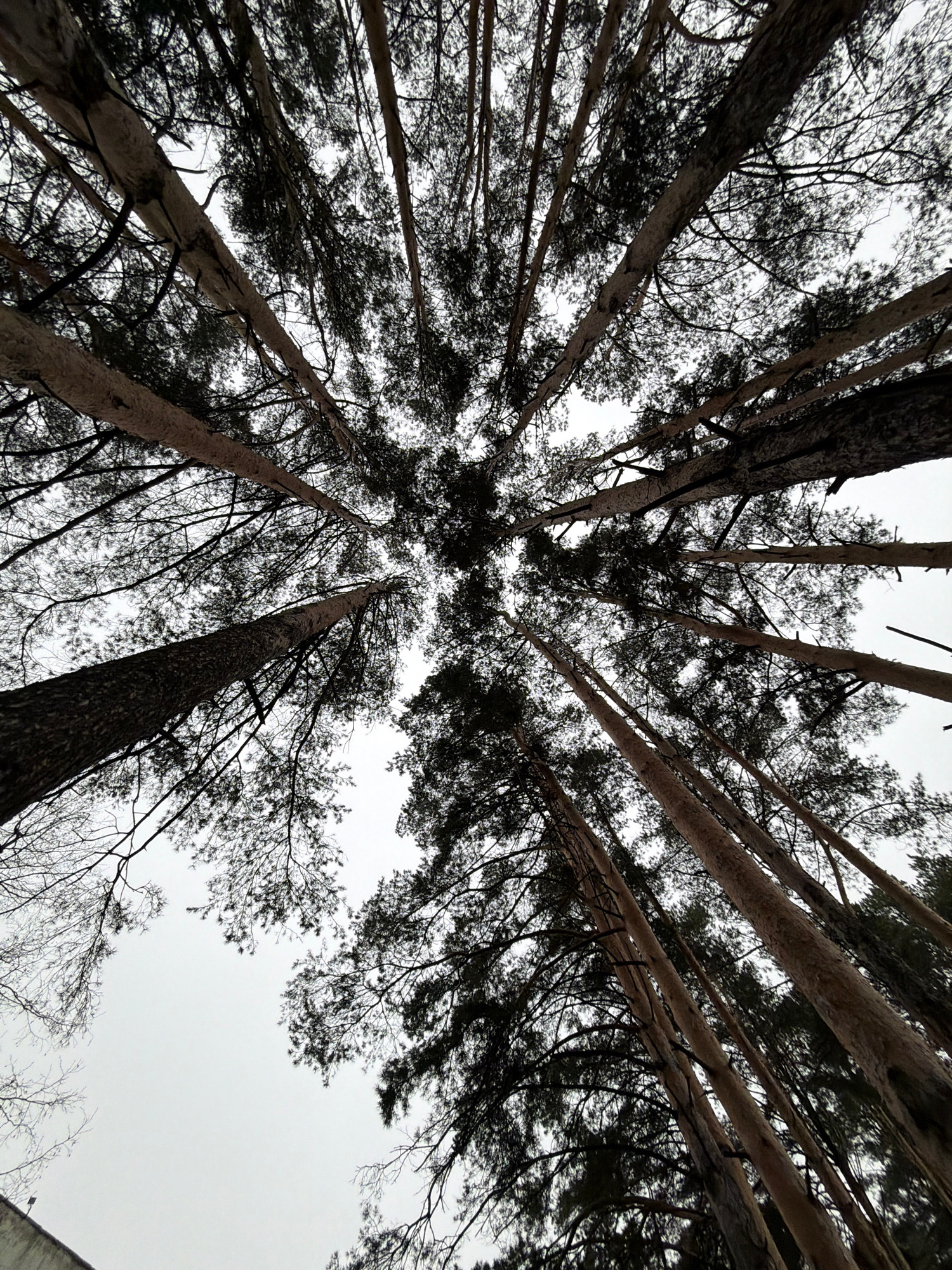 The image shows a low-angle perspective looking upwards through a dense forest. Tall trees, likely pines or similar conifers, stretch upwards, their trunks converging towards the center of the frame.…read more