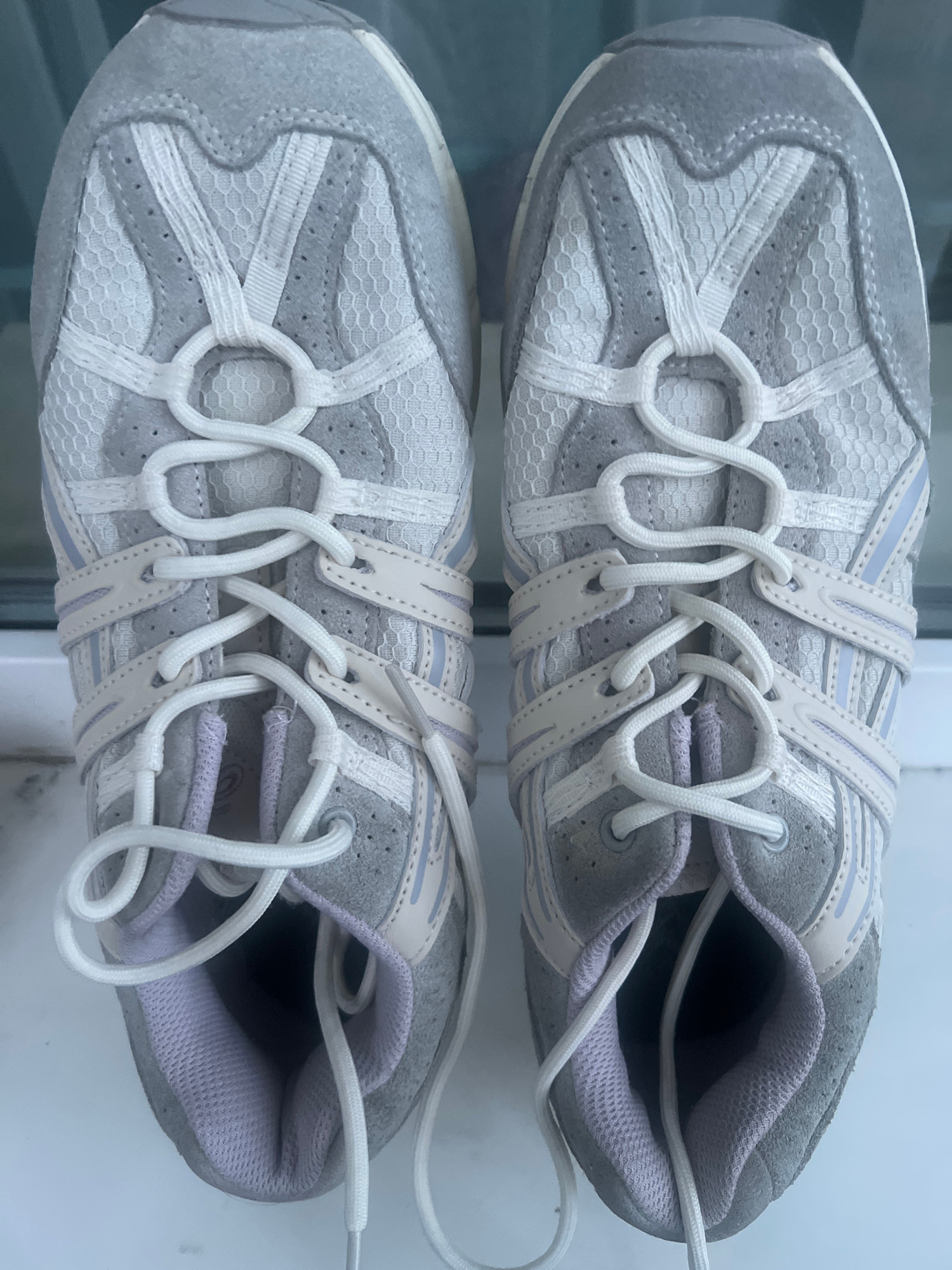 A pair of light gray athletic shoes with white laces are positioned side-by-side on a surface. The shoes are predominantly gray with white mesh and accents. They feature a toggle lacing system. The vi…read more
