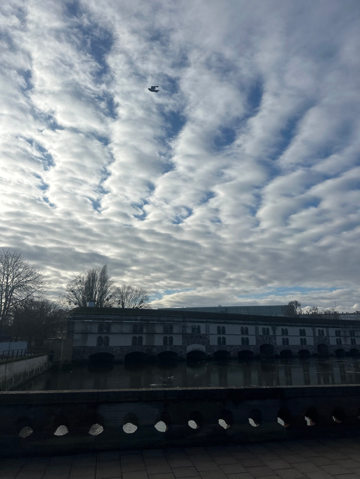 The image depicts the Barrage Vauban in Strasbourg, France, viewed from an elevated perspective on a cloudy day. In the foreground, a dark stone balustrade with multiple circular openings extends hori…read more