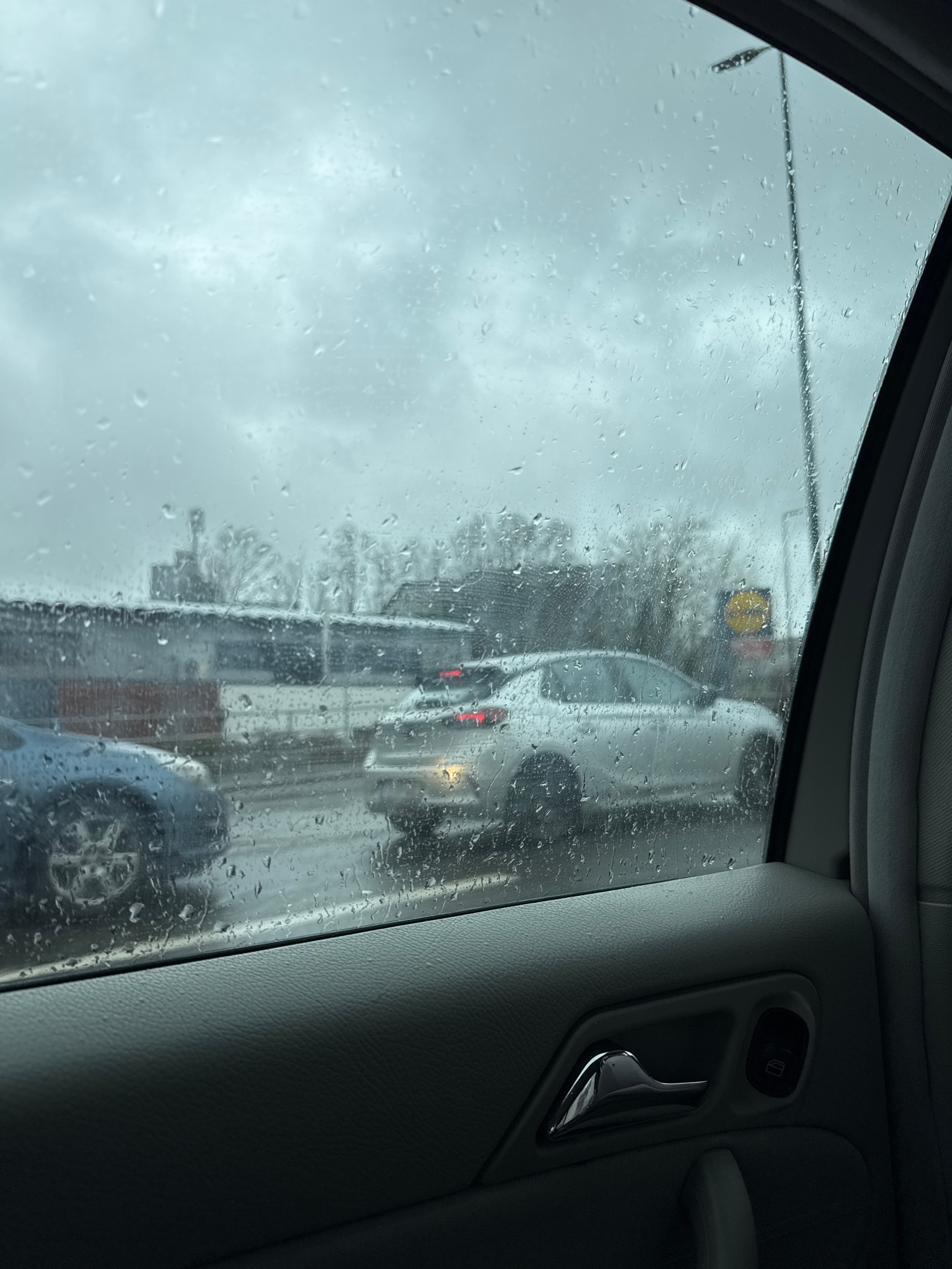 A view from inside a vehicle on a rainy day. Raindrops obscure the view through the window. Outside, there is a street with cars, buildings, and a traffic light. The location appears to be in Remschei…read more