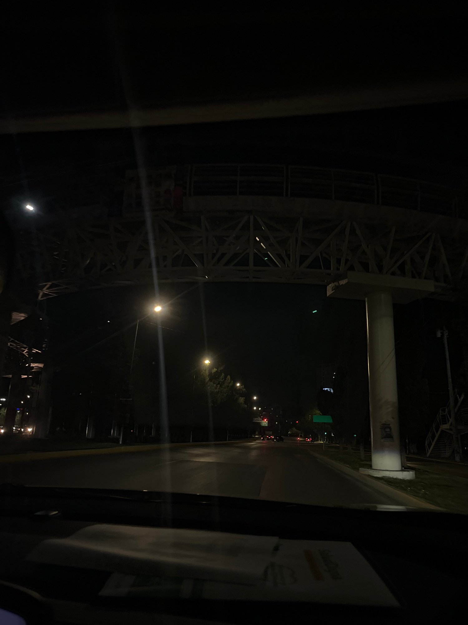 The image depicts an evening view from inside a vehicle in Puebla, Mexico. The scene is dominated by the metal framework of a large bridge, possibly the Distribuidor Vial Zaragoza bridge, illuminated…read more