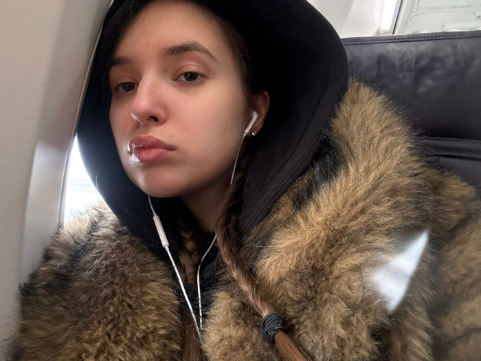 A young female is observed seated inside an aircraft, occupying a window seat on the left side of the frame. She wears a black hooded garment, with the hood pulled up, and a prominent brown and tan fa…read more