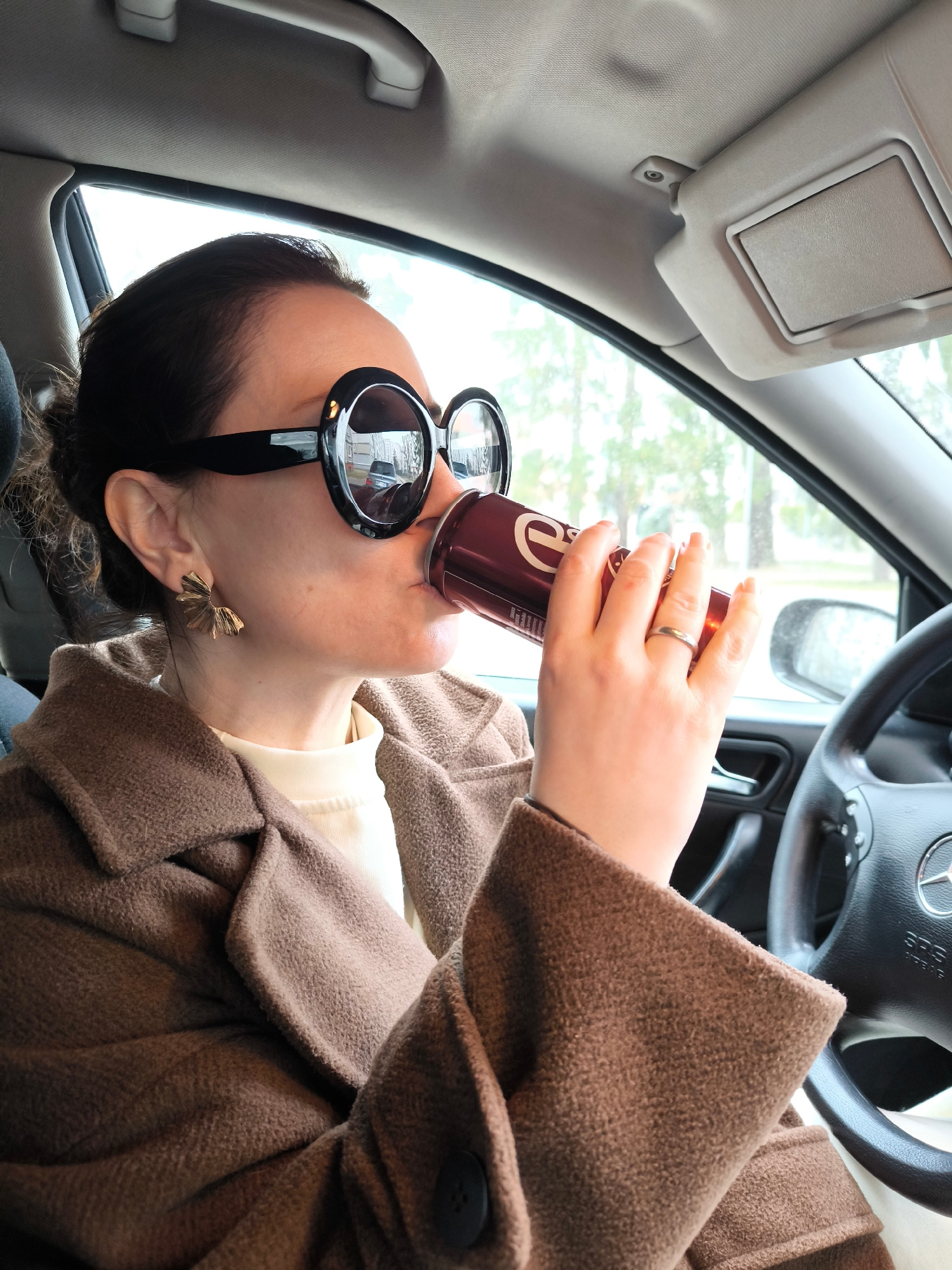 A woman is sitting in the driver's seat of a Mercedes-Benz, drinking from a red can. She is wearing large, round, black sunglasses, gold earrings, a white turtleneck sweater, and a brown wool coat. He…read more