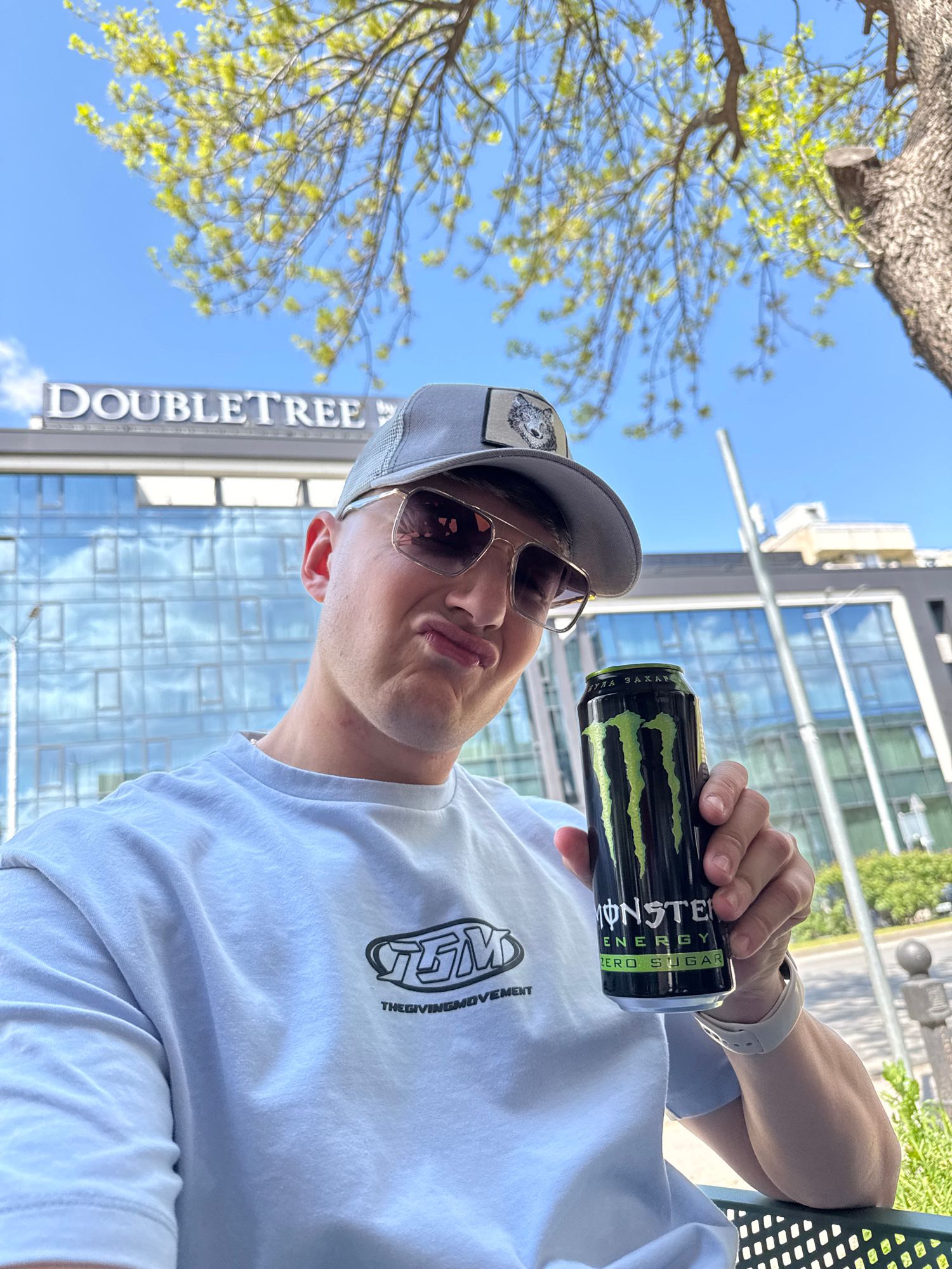 A man, presumably in his late teens or early twenties, is holding a can of Monster Energy Zero Sugar drink. He is wearing a grey baseball cap with a small patch featuring a bear design, sunglasses wit…read more