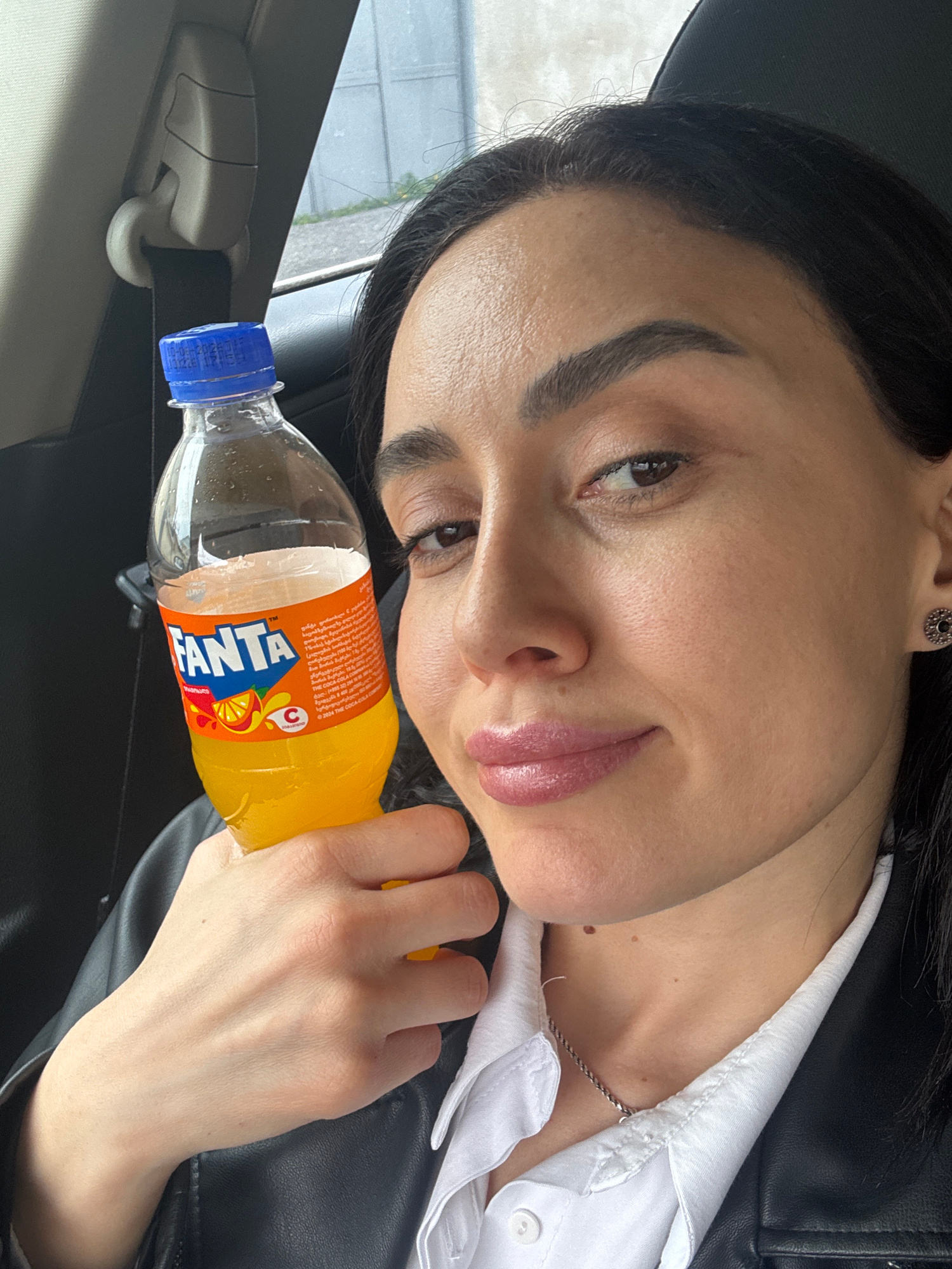 A woman with dark hair is holding a bottle of Fanta orange soda. She is wearing a white shirt underneath a black jacket and a silver necklace. It appears she is in a car. The Fanta bottle label featurβ¦read more