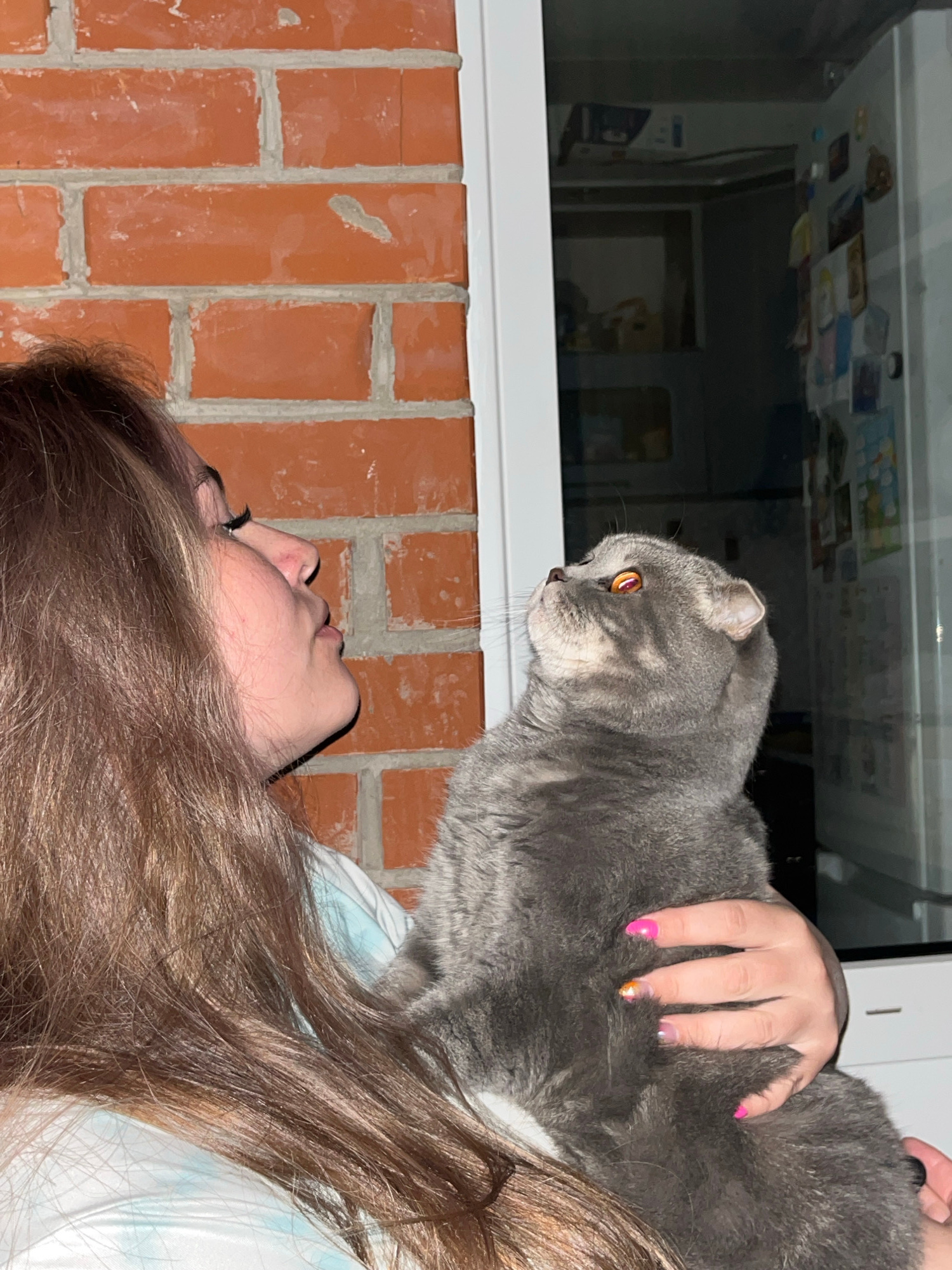 A grey Scottish Fold cat with yellow eyes is perched on a red brick windowsill, closely positioned over a person lying on a white and blue patterned surface. The person's face is visible, along with t…read more