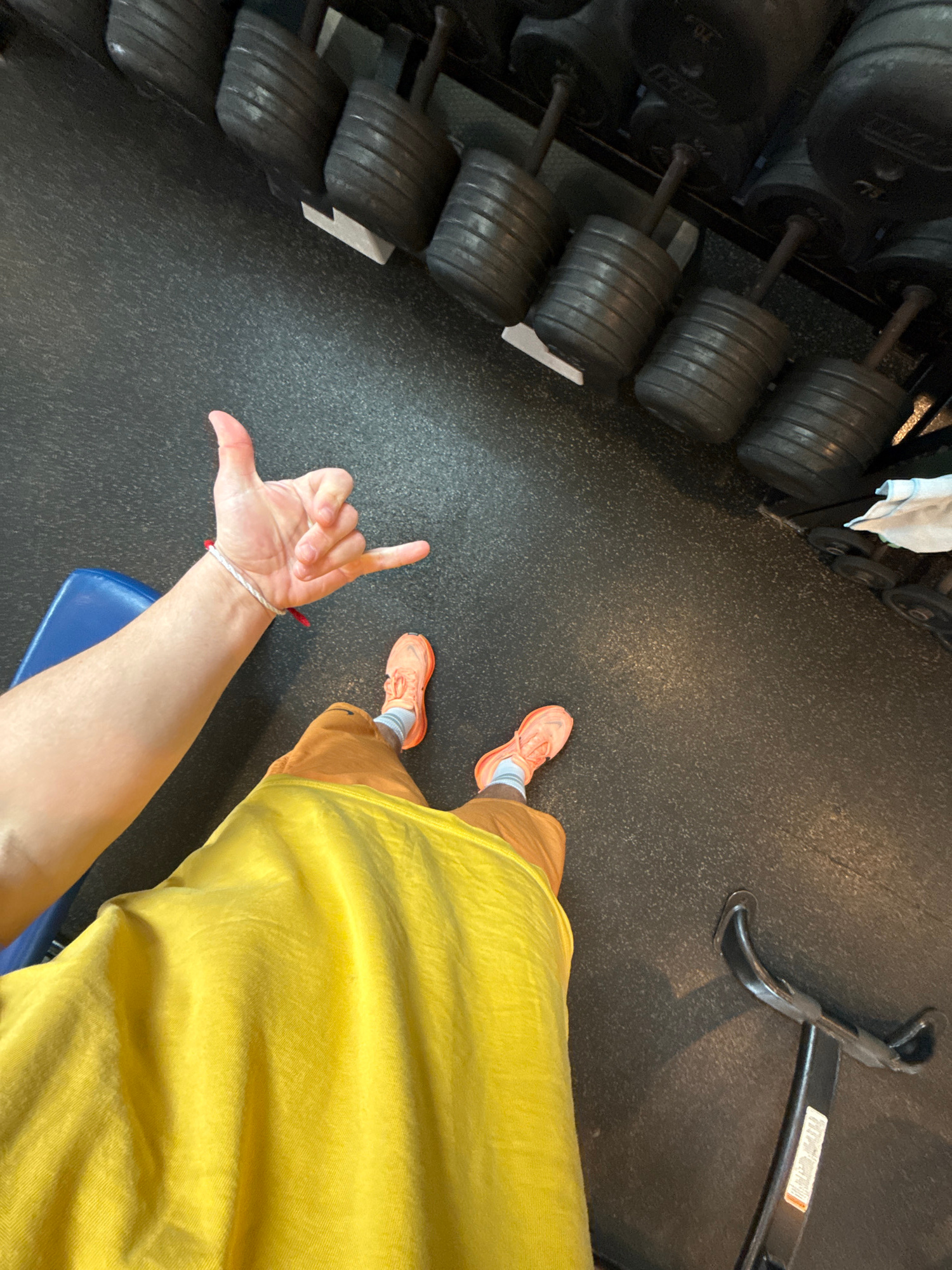 A view from above depicts a person in a gym. The person is wearing orange running shoes with white socks, tan shorts, and a yellow shirt. They are seated on a blue bench. Their left hand is raised, ma…read more