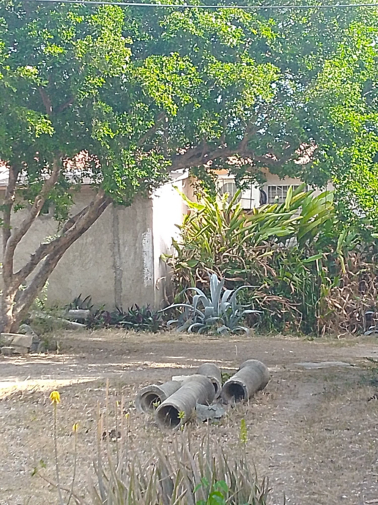 The scene appears to be a yard or vacant lot in a residential area. A partially obscured building with white framed windows is visible behind dense vegetation. Large, cylindrical concrete or clay pipe…read more