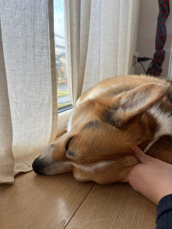 In Gangloff, Germany, a tan, white, and black Pembroke Welsh Corgi is observed lying on a light wooden floor. The dog's eyes are closed, indicative of sleep or rest, with its head positioned near a wi…read more