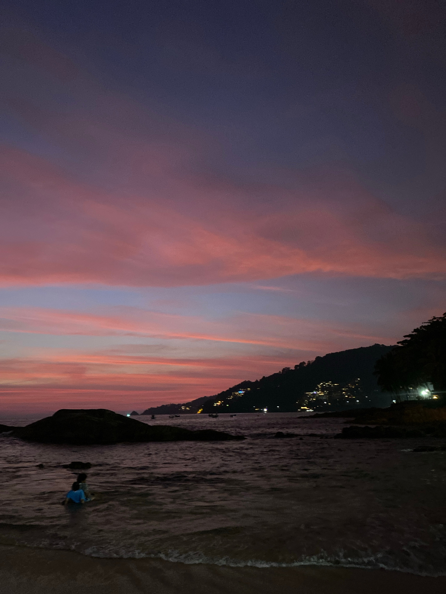 The photograph depicts a beach scene at dusk in Patong, Thailand. The sky is filled with pink and blue streaks, suggesting a sunset. Adjacent to the sky, there is a silhouette of a hill or mountain, w…read more