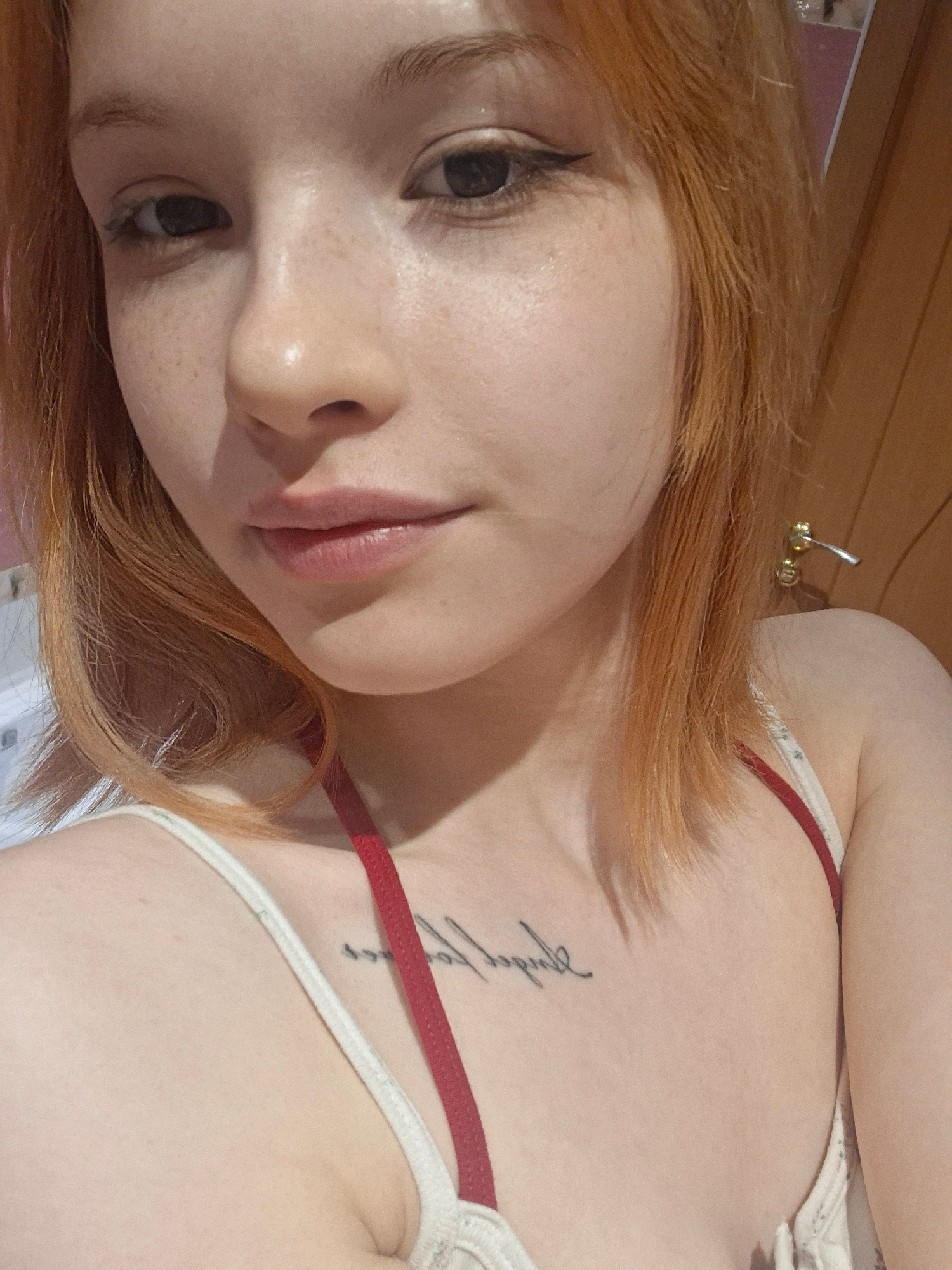 A fair-skinned, red-haired woman with freckles is angled in an indoor space with a wooden background. She wears a white tank top with red straps and has a tattoo on her collarbone. A gold stud earring…read more