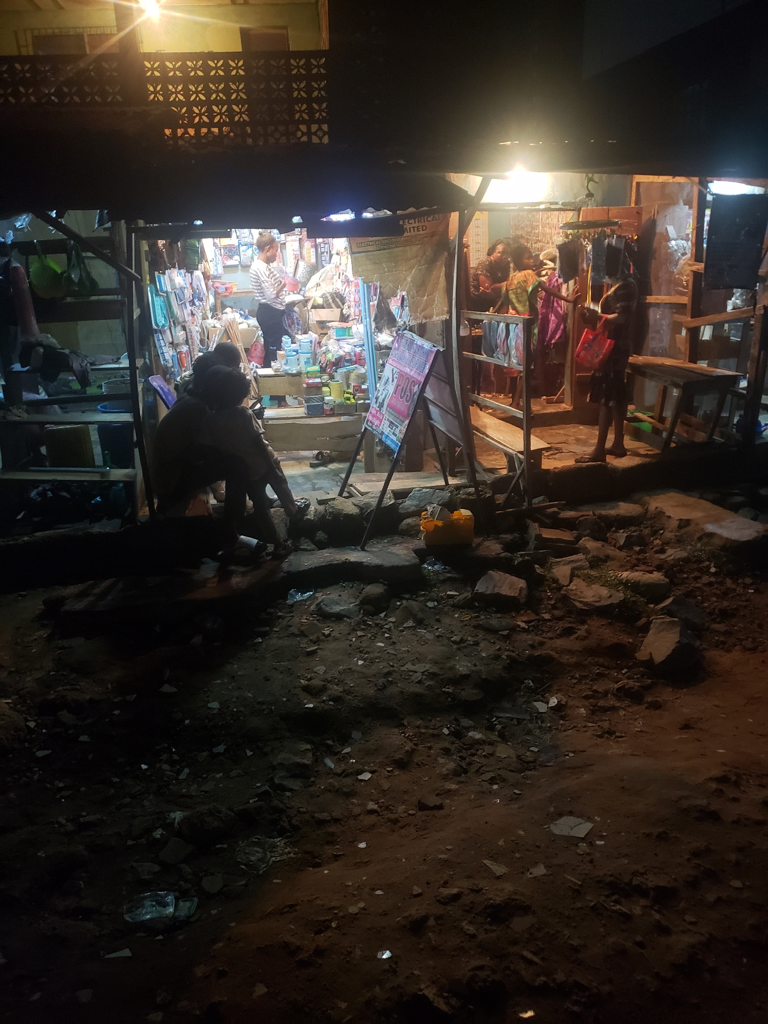 The image depicts a night scene in Alalubosa, Nigeria. A small retail shop is illuminated by bright overhead lights, revealing a variety of merchandise on shelves. Several people are inside the shop,…read more