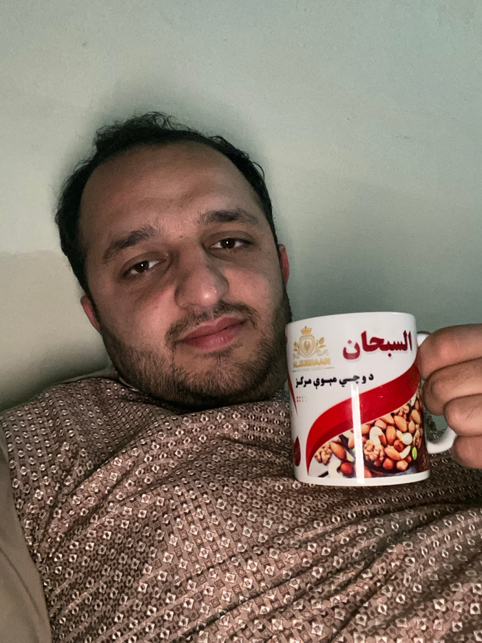 A man is holding a mug with nuts printed on it. The mug has Arabic text. He is wearing a patterned shirt with small square designs. The man has dark hair and a beard. The background appears to be a pl…read more