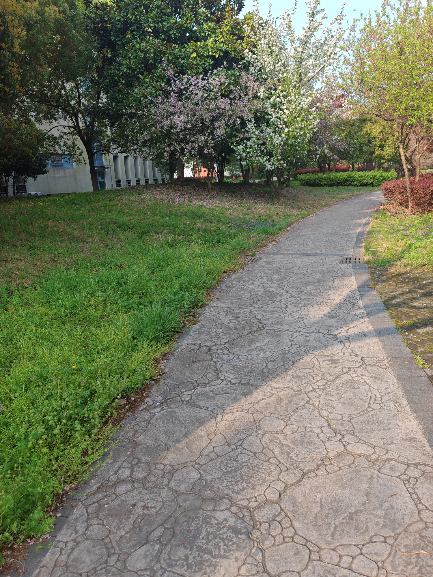 The image depicts a paved pathway in a park-like setting, possibly located in the Jiangning District, China, based on the presence of specific flora and architectural styles common to the region. The…read more