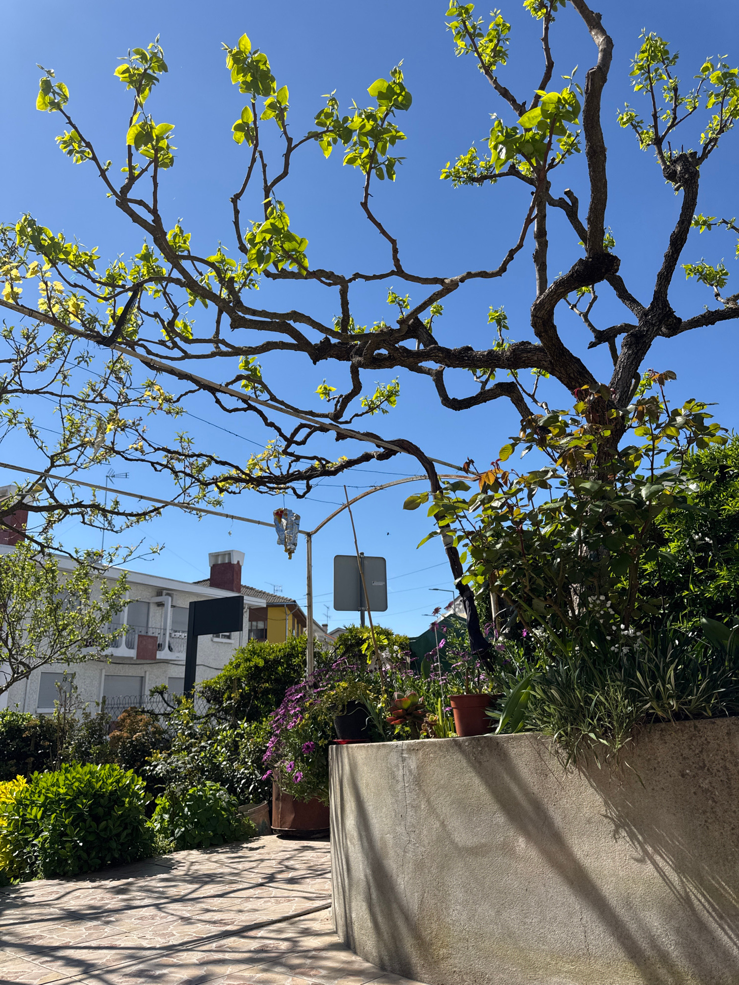 This image depicts an outdoor residential garden area under a clear, bright blue sky in Mirandela, Portugal, during daylight hours, likely in spring due to the new foliage. The scene is static, devoid…read more