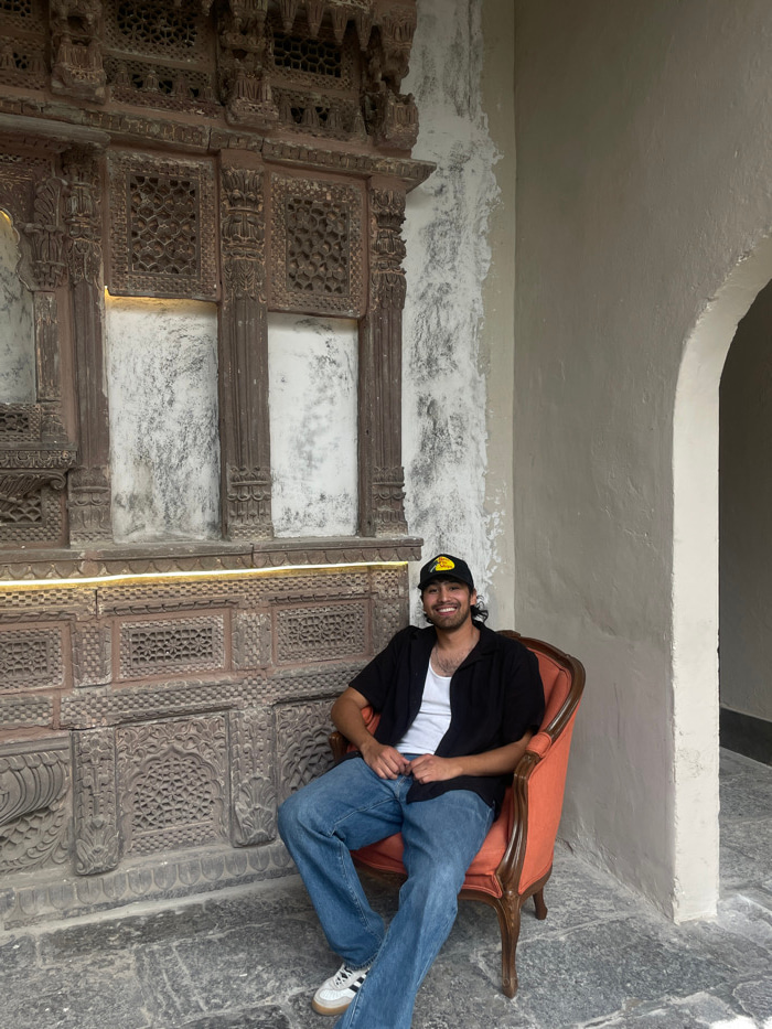 A single male subject, approximately 20-35 years old, is seated in a reddish-orange upholstered armchair. He has dark hair, a mustache, and short beard stubble, and is wearing a black baseball cap witβ¦read more