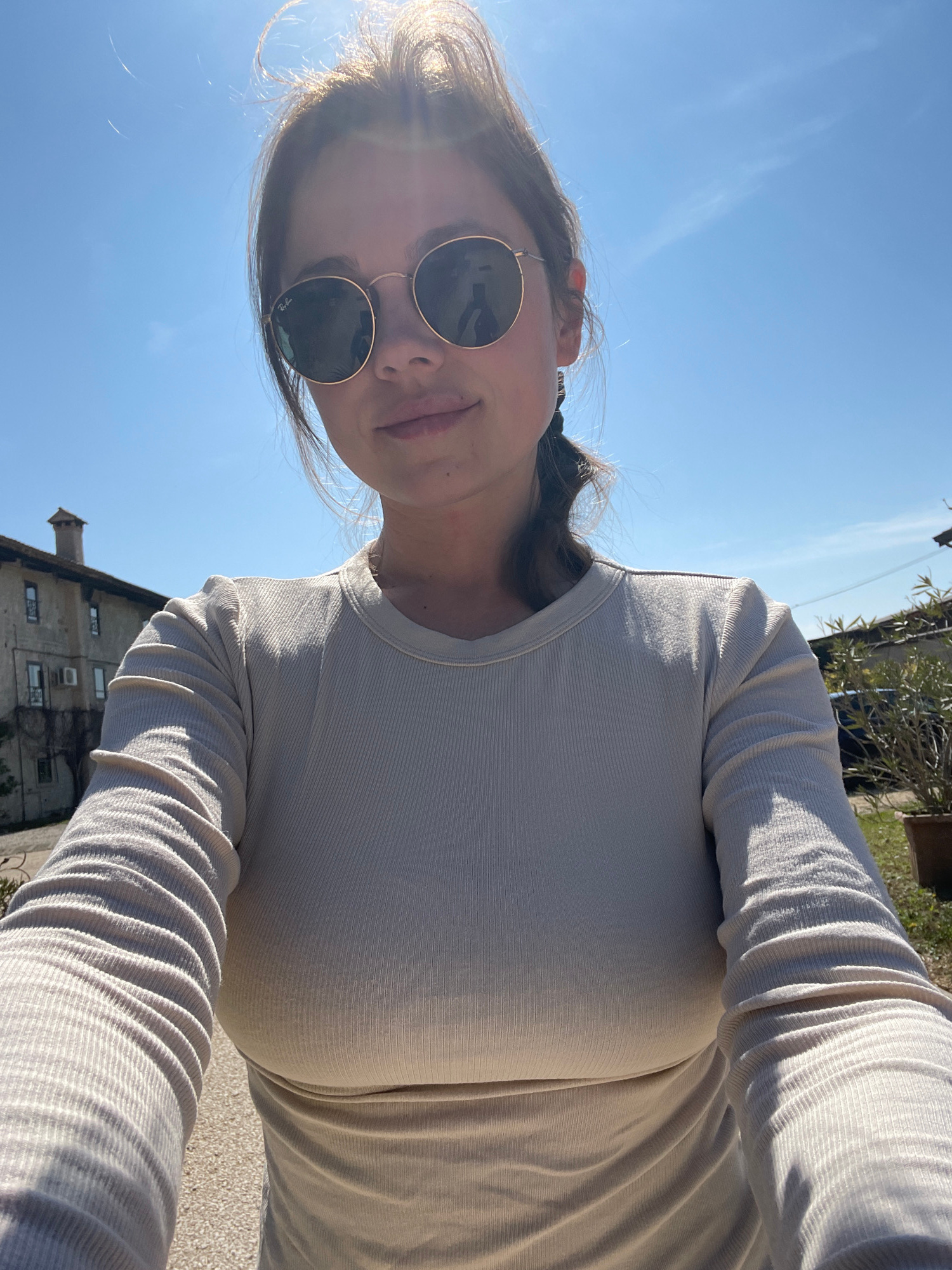 A woman wearing sunglasses and a long-sleeved ribbed shirt is taking a selfie on a sunny day in San Lorenzo, Italy. The sky is clear blue. In the background, there's a building with windows and a smal…read more