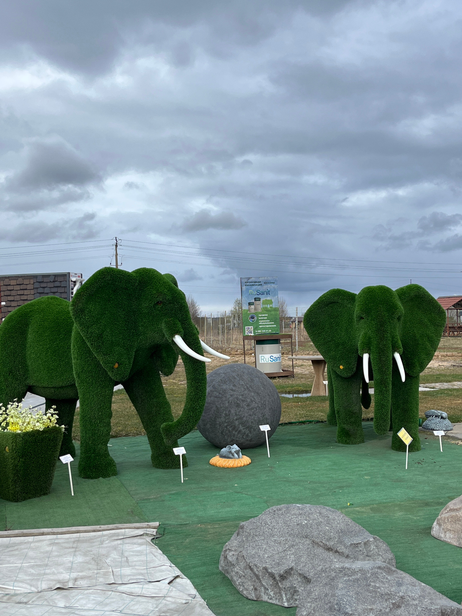 The image shows a display of green, moss-covered elephant sculptures and decorative stones in an outdoor setting, likely a sales area, in Bezborodovo, Russia. Two elephant sculptures are the primary f…read more
