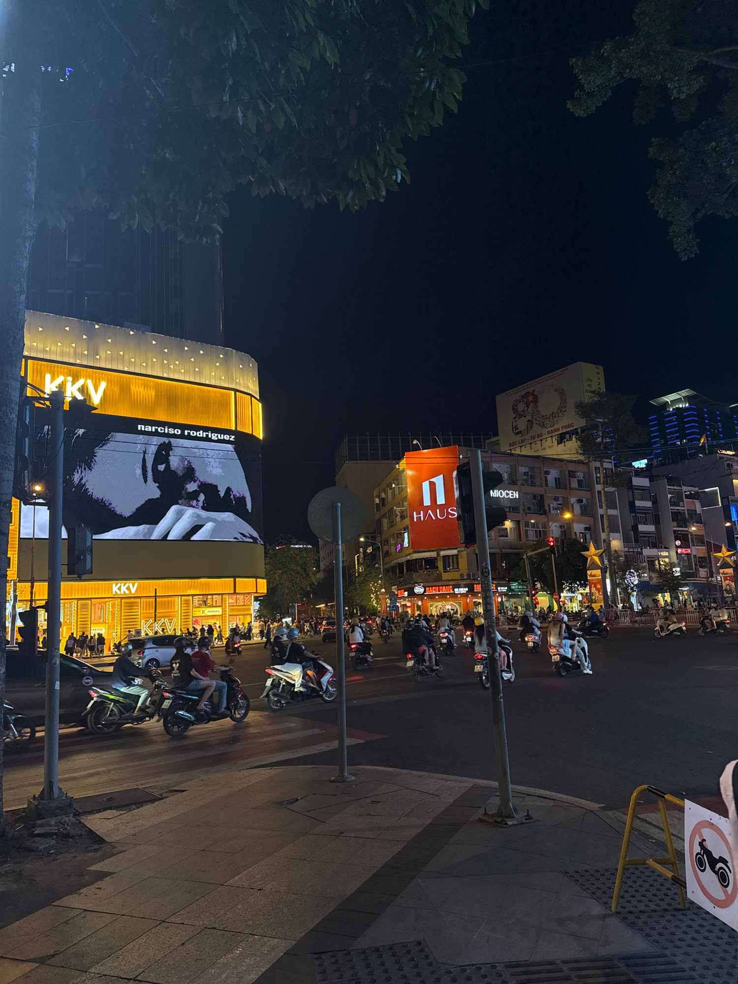 At night, the city street of Thủ Đức, Vietnam, is seen from an elevated perspective. A large building is illuminated with an advertisement for Narciso Rodriguez and the company KKV. Other businesses, including MIOCEN, HAUS, and BACH DANG are visible. Many scooters are parked along the street. A tree is on the left. A sign with a symbol of a scooter with a line through it, indicating the prohibition of scooters in a certain area, is in the foreground. A sidewalk and some buildings can be seen on the far right. | Open Wire