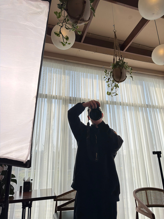The image depicts an indoor scene within what appears to be a modern cafe or restaurant in Tashkent, Uzbekistan. A single individual, silhouetted against a brightly lit window background, is centrally…read more