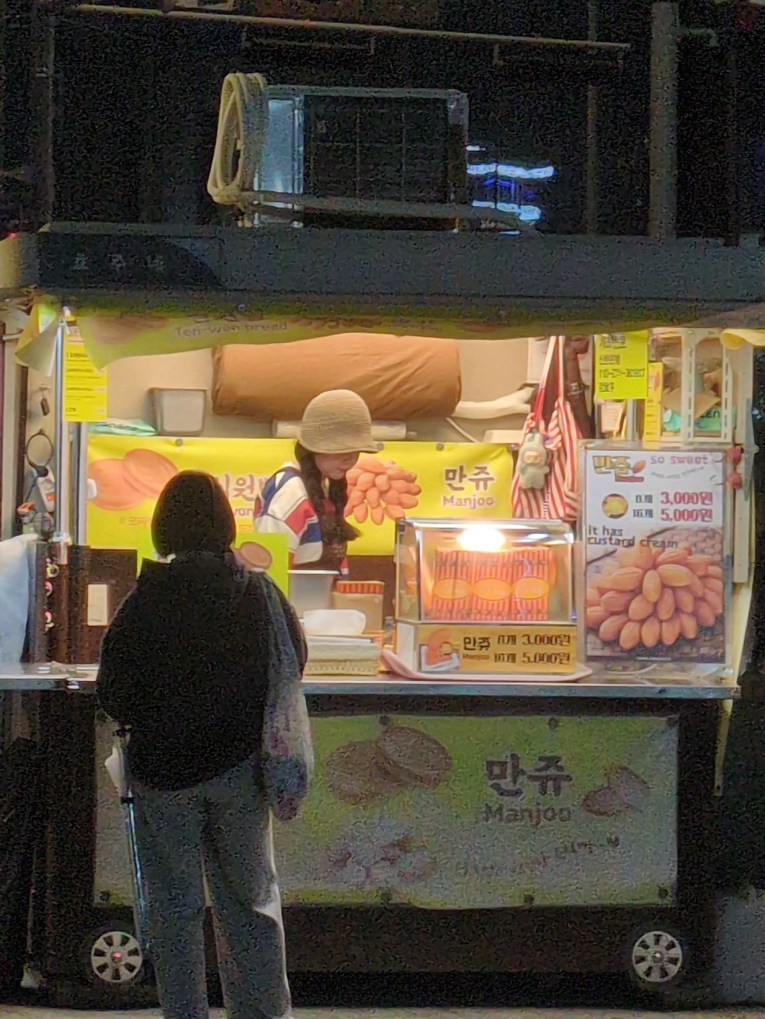 The image shows a mobile food vendor in Seoul, South Korea, specializing in "Manjoo" (a type of filled cake). A person is seen interacting with the food cart. The cart displays promotional materials,…read more