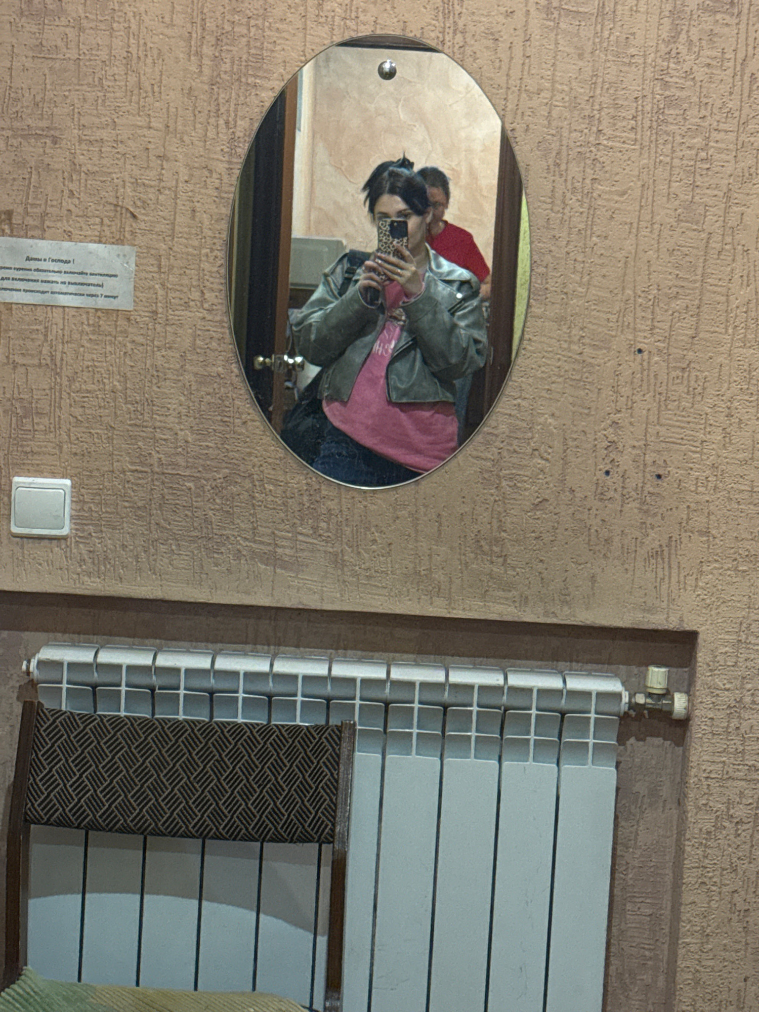 The image shows an interior wall with an oval mirror, a radiator, a light switch, and a piece of paper. The wall is textured with a rough, uneven surface and is painted a light brown color. In the mir…read more