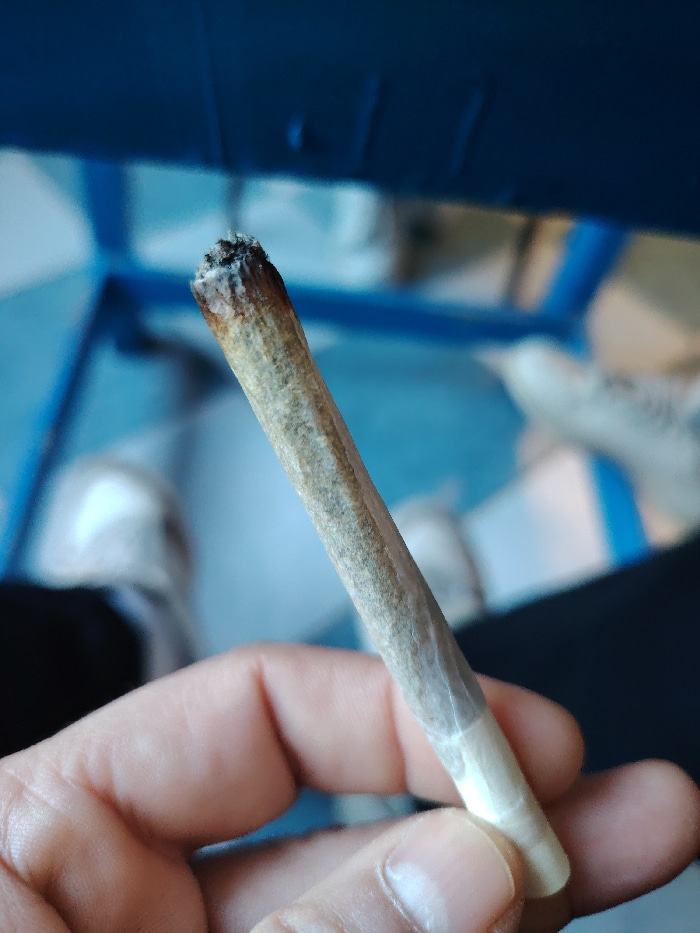 A hand holds a partially smoked rolled cigarette or marijuana joint, lit at the end. The joint has a tan color and is wrapped in thin white paper, tapering slightly towards the unlit end. Background fâŚread more
