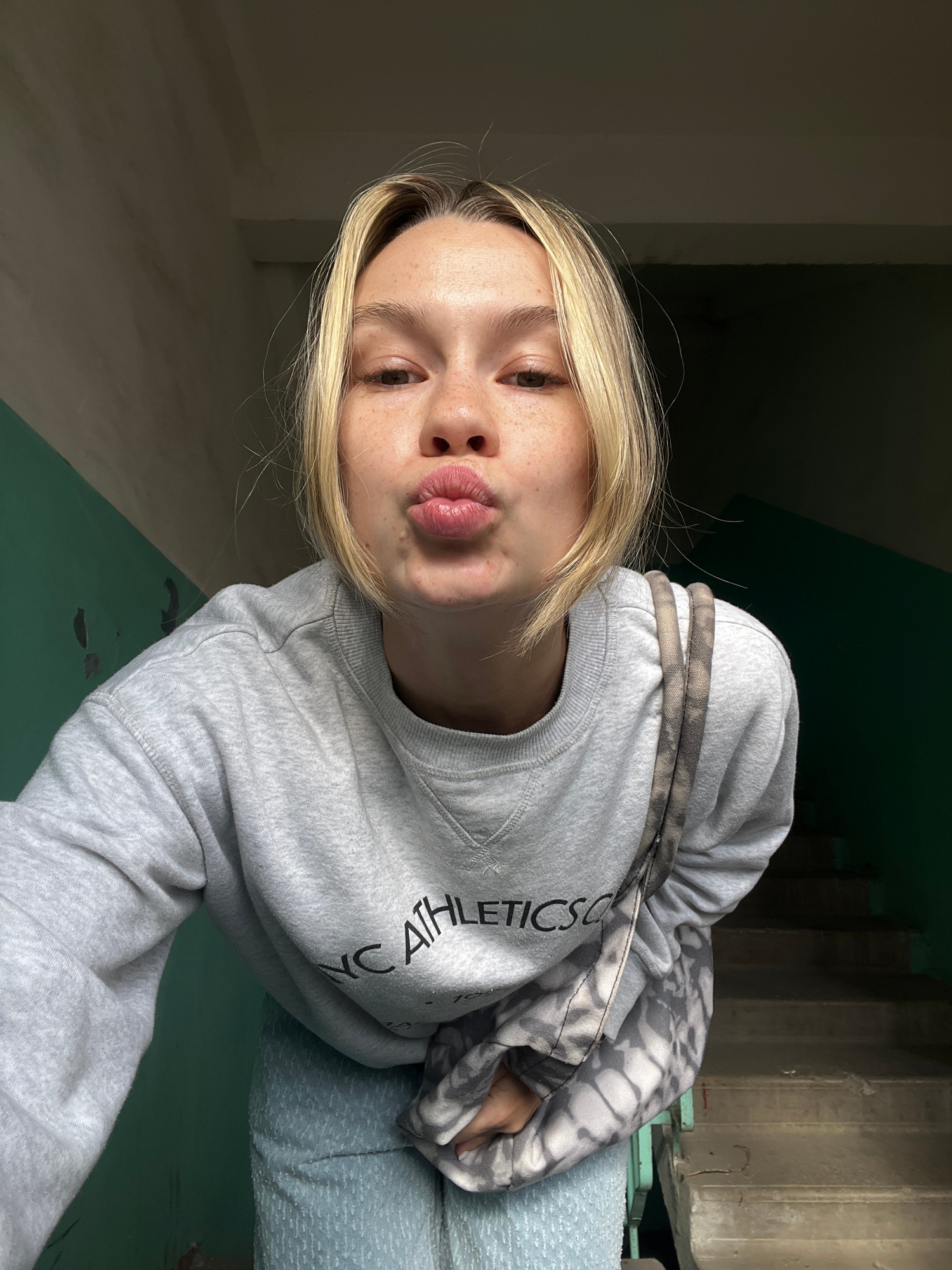 The image is a rotated selfie featuring a young person, likely female, with blonde hair, light skin, and numerous freckles visible across their nose and cheeks. The individual is looking directly intoβ¦read more