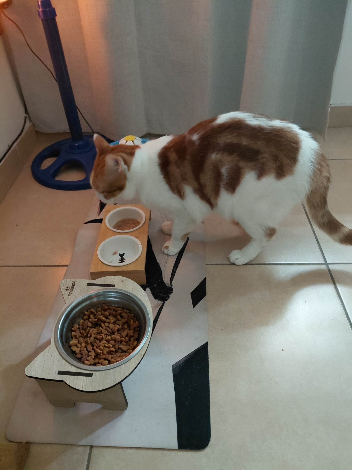 A domestic cat with orange and white fur stands next to a cat feeding station. The feeding station, placed on a black and white mat, consists of two separate wooden platforms holding bowls. The left p…read more