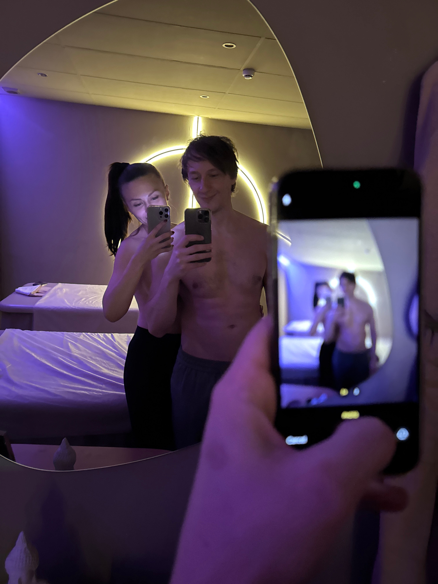 A man and a woman stand together in a room and take a selfie in a mirror. The man is bare-chested and wearing gray pants. The woman is wearing a black top. The mirror's shape is irregular. A circular…read more