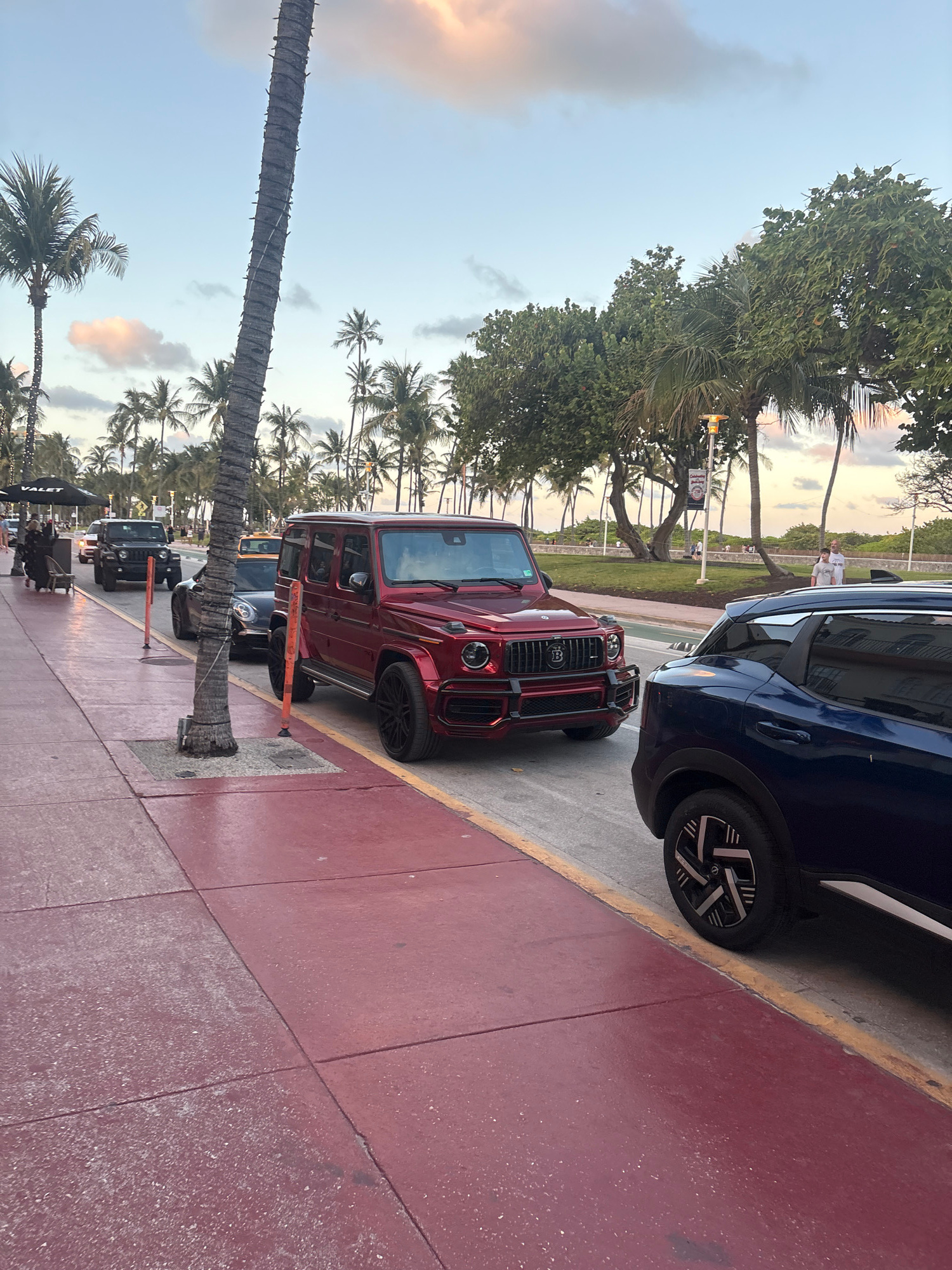 The image captures a street scene, likely at dusk or dawn, given the soft, warm hues in the sky. The perspective is from a low angle, looking across a wide red sidewalk towards a street lined with par…read more