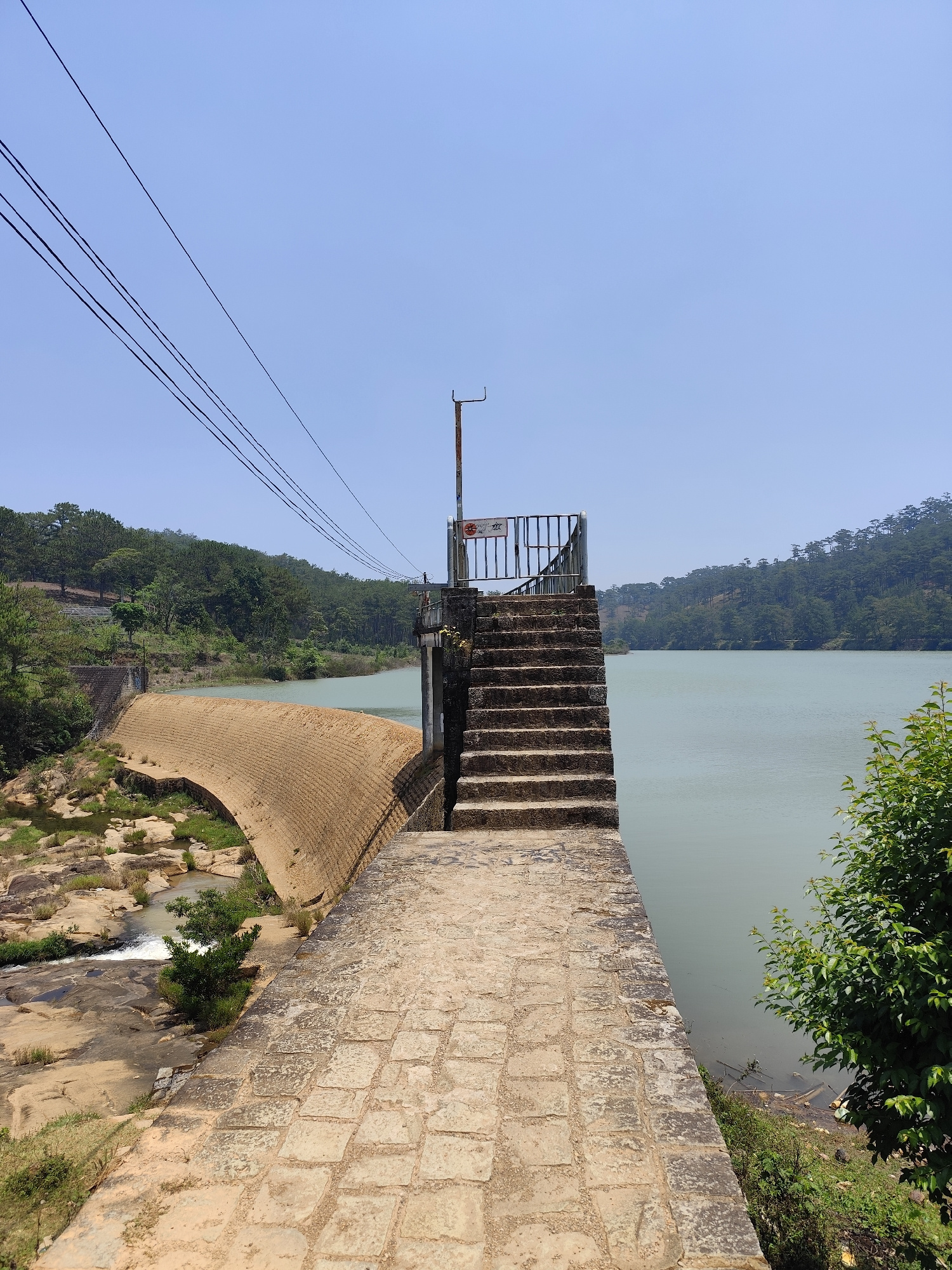 The image depicts a concrete dam and spillway in Lang Biang - Da Lat, Vietnam. The structure has a staircase leading to a small observation platform with metal railings, adjacent to a reservoir. A ser…read more