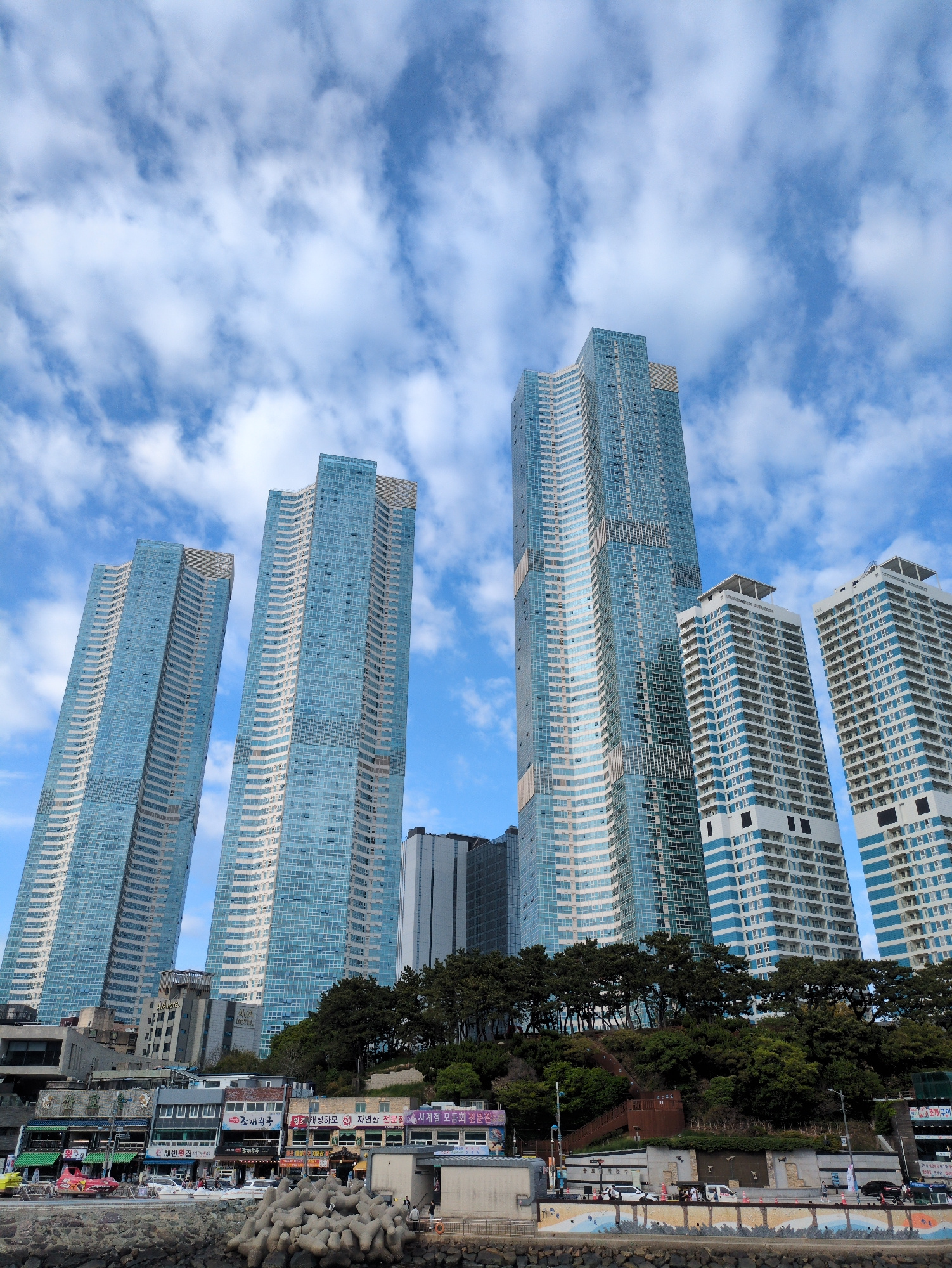 The image is of the Haeundae LCT The Sharp skyscrapers in Busan, South Korea. The photo is taken from a low angle, looking up at the buildings against a blue sky with scattered clouds. The tall, moder…read more