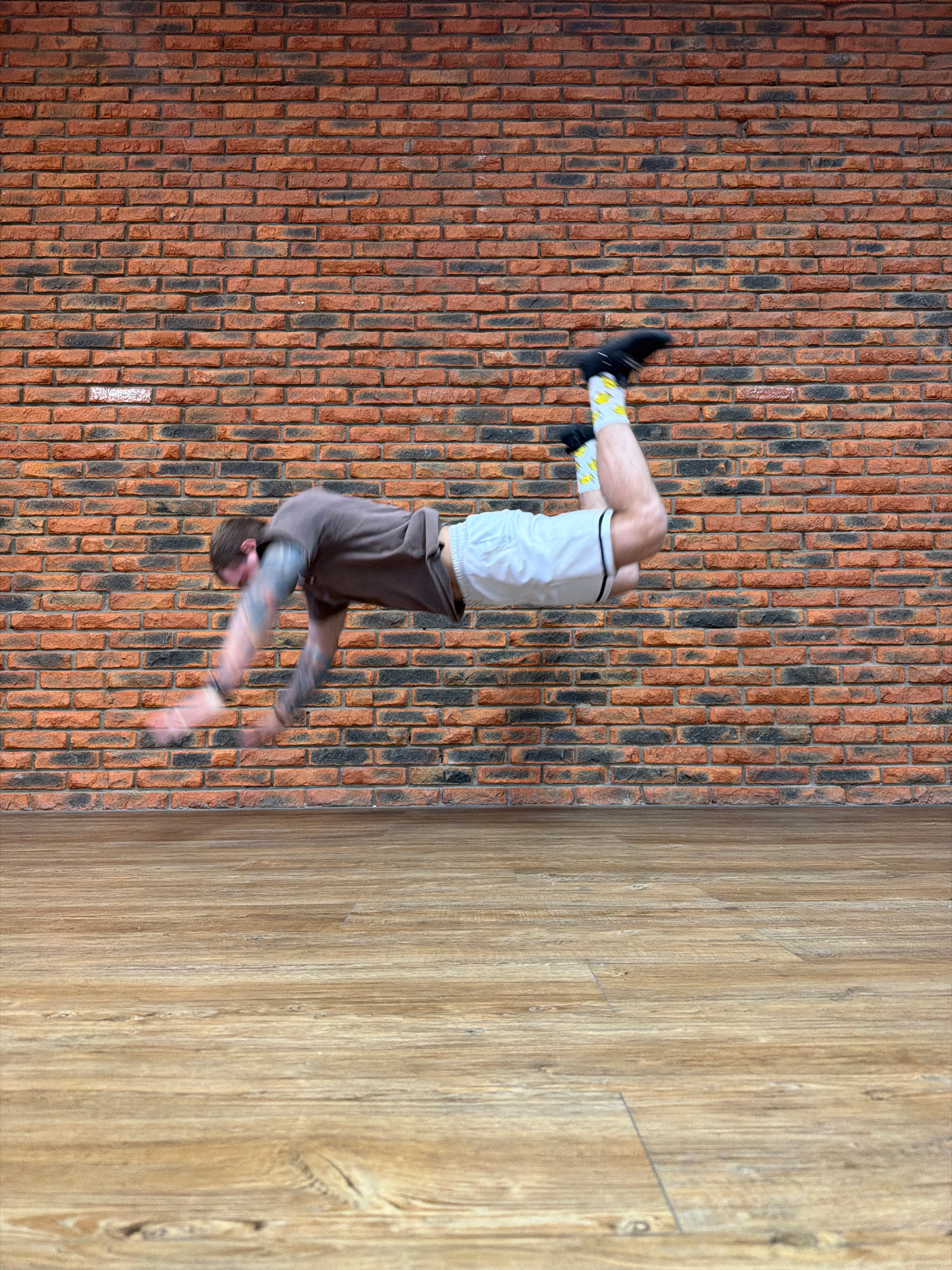 The image depicts a man in motion, captured mid-air in what appears to be a backflip. He is wearing a brown hoodie, white shorts, and socks with a design. His arms are extended, and the motion is blur…read more