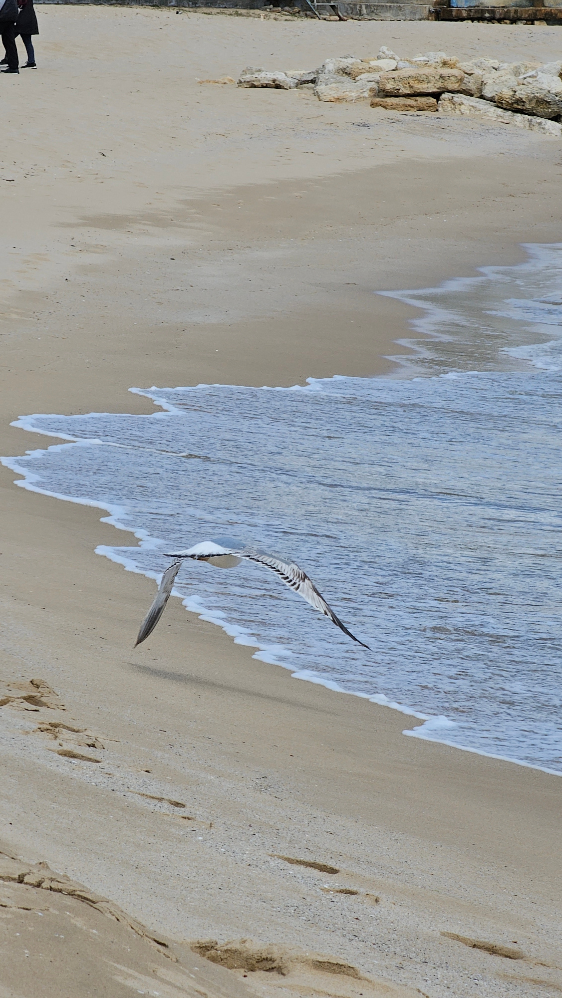 A rotated aerial shot of a beach in Varna, Bulgaria, showing wet sand being washed by the ocean, with a bird in flight. The sand is light beige with visible footprints. The ocean water is white and li…read more