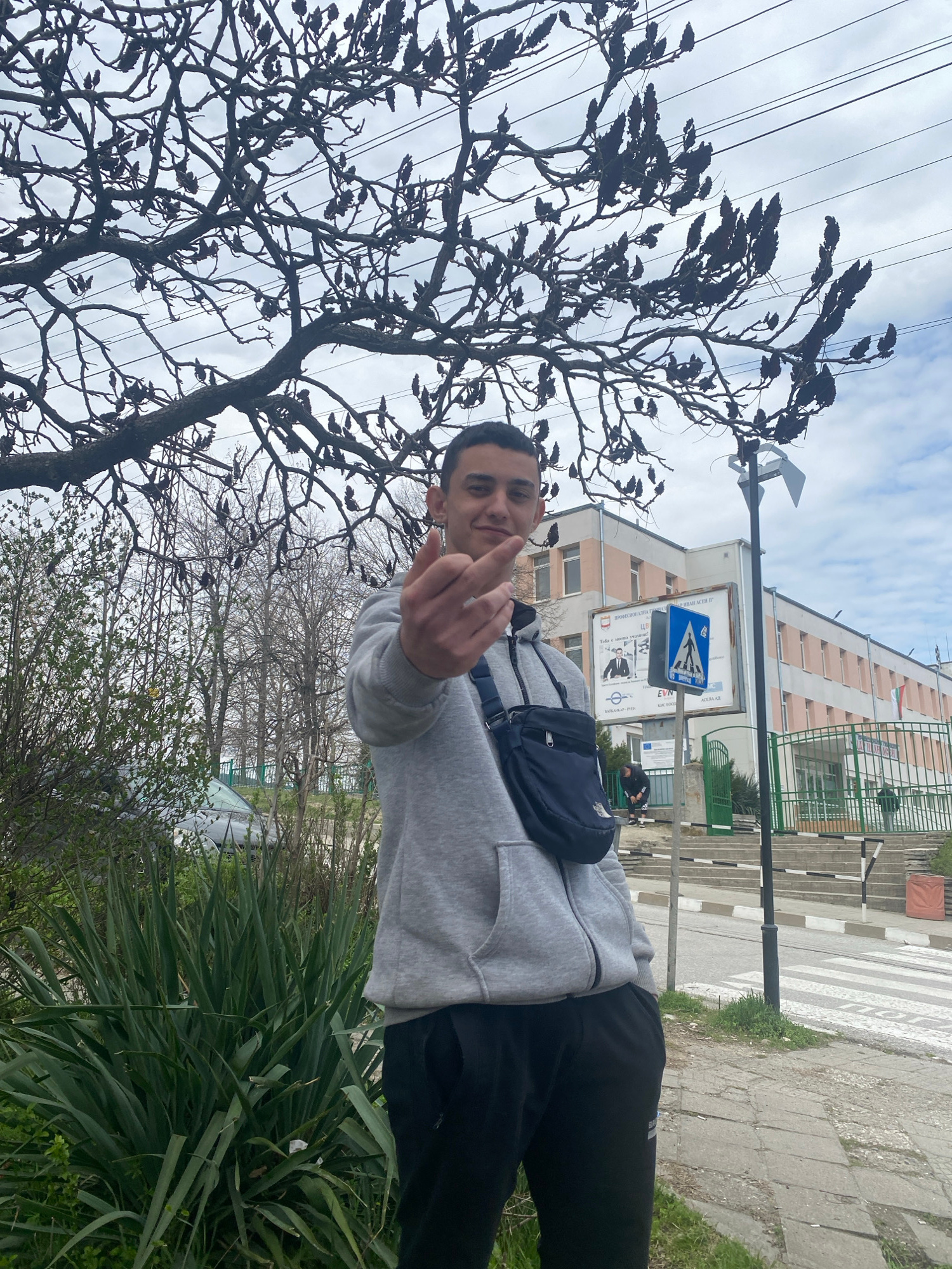 A young man stands outdoors in Asenovgrad, Bulgaria, next to a tree with dense, dark foliage and utility wires overhead. He faces the camera and is making an obscene gesture with his middle finger. He…read more