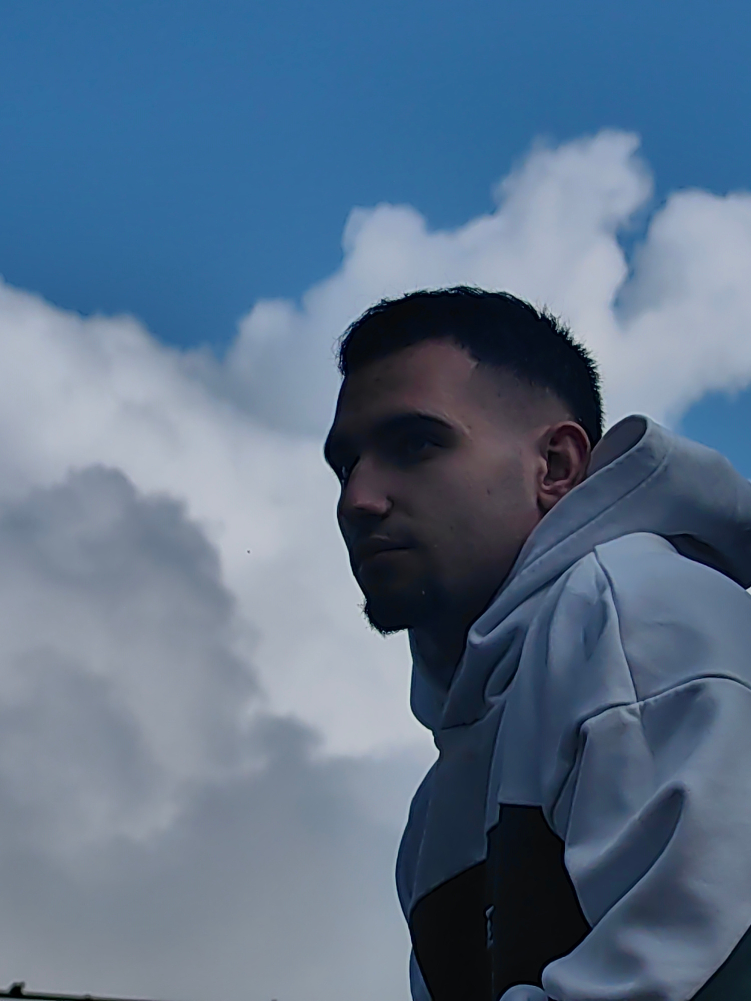 A young adult male with dark hair cut in a faded style is looking left. He has a short beard and is wearing a light-colored hooded sweatshirt. The background is composed of a cloudy sky. There is not…read more