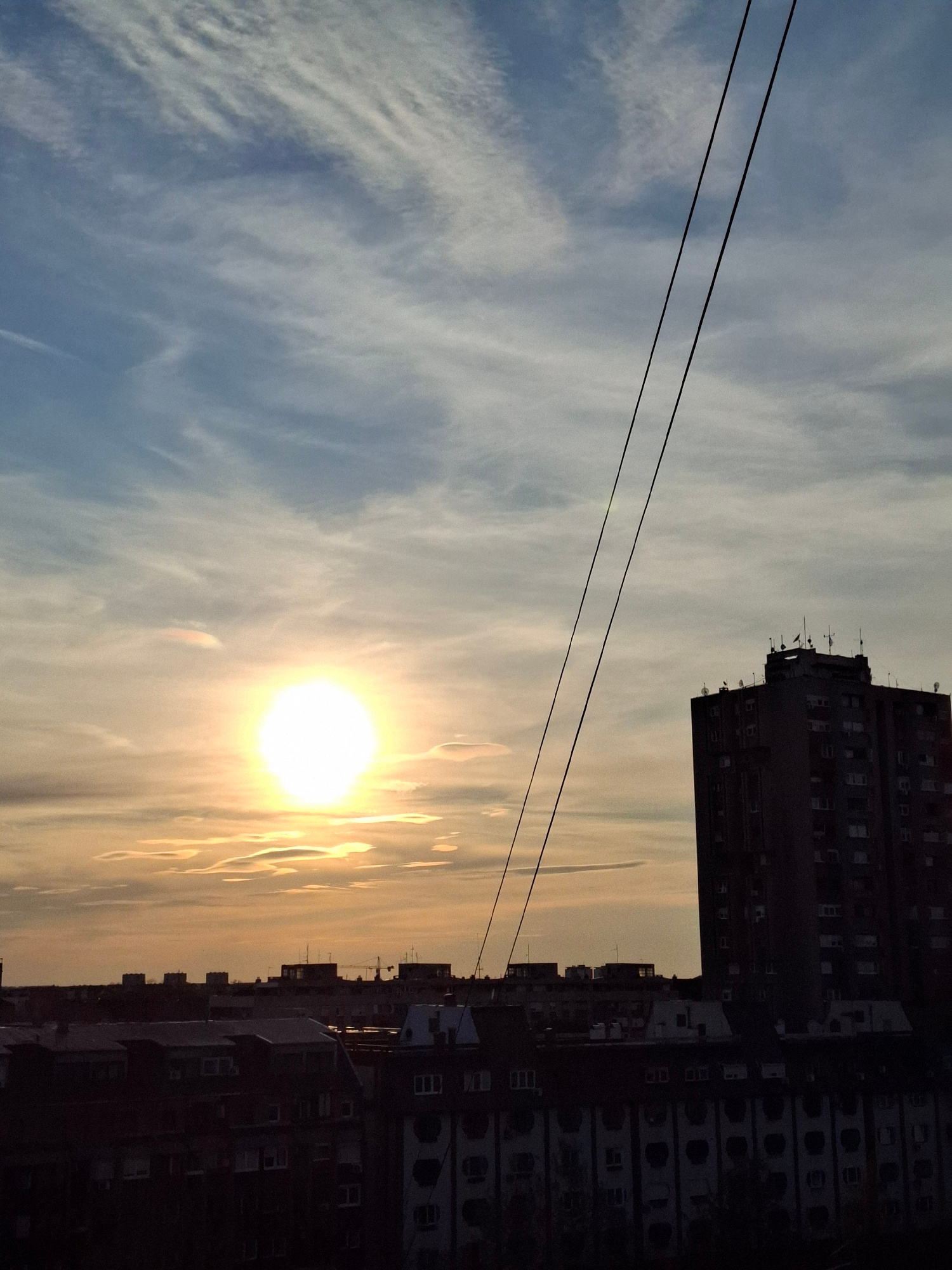 The image depicts an urban scene in Novi Sad, Serbia, during what appears to be a sunset or sunrise. The sun is positioned low in the sky, emitting a bright glow. Buildings are seen in the foreground…read more