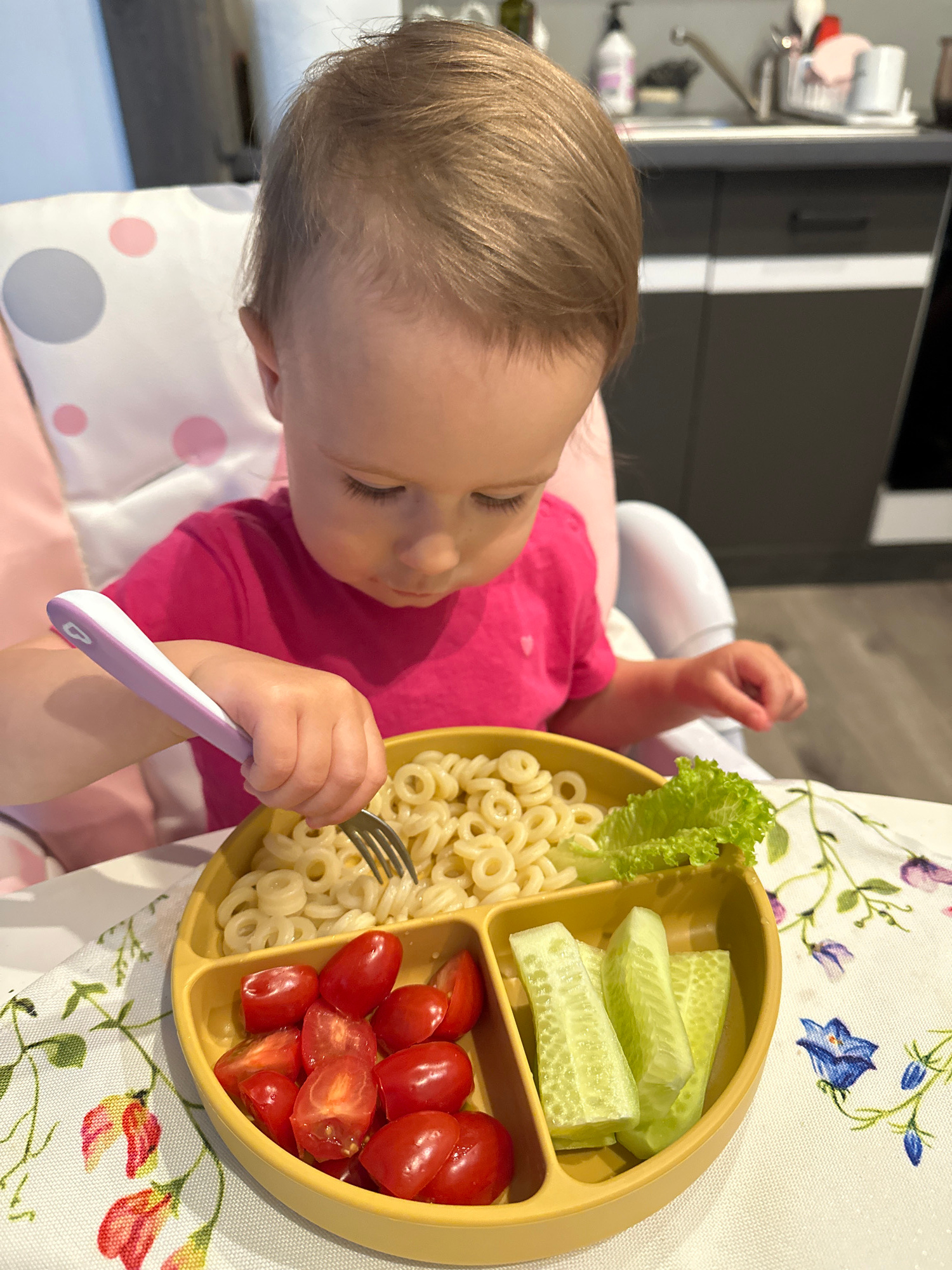 A young child wearing a pink shirt sits in a high chair with a white tray decorated with pink and grey polka dots. The child is holding a purple and white fork and is eating pasta from a yellow divide…read more